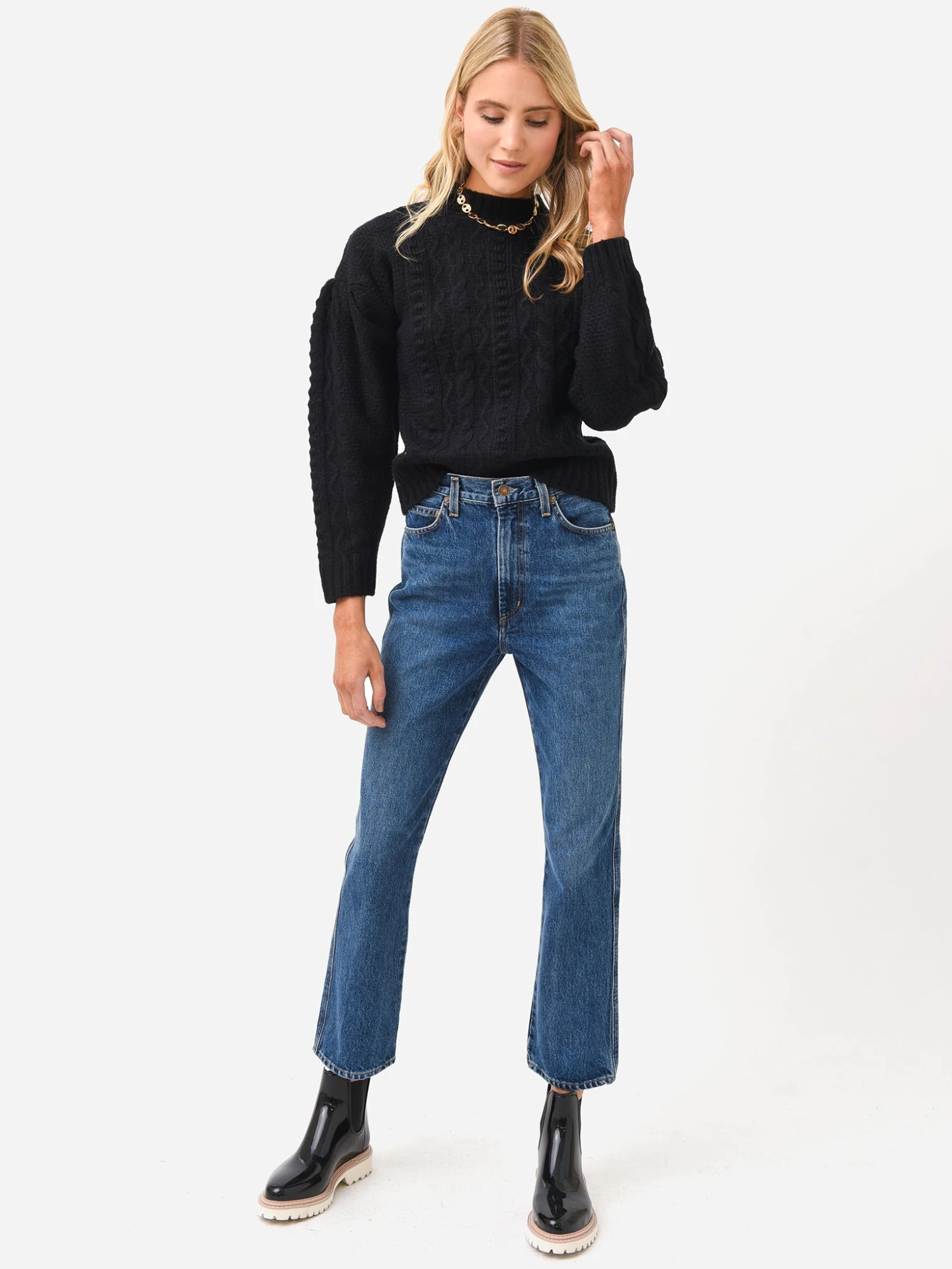 Mock neck cable knit sweater with puffed sleeves.