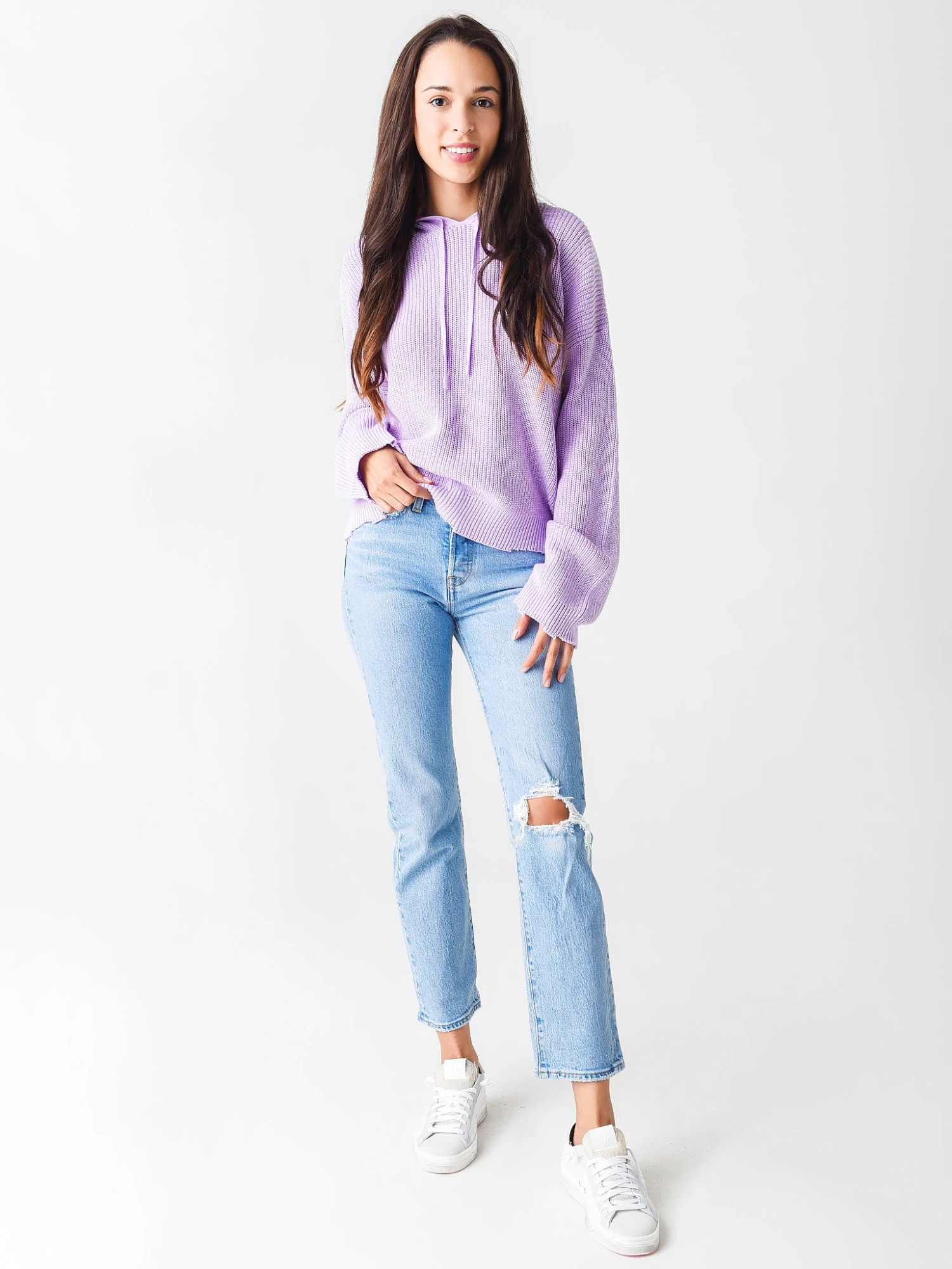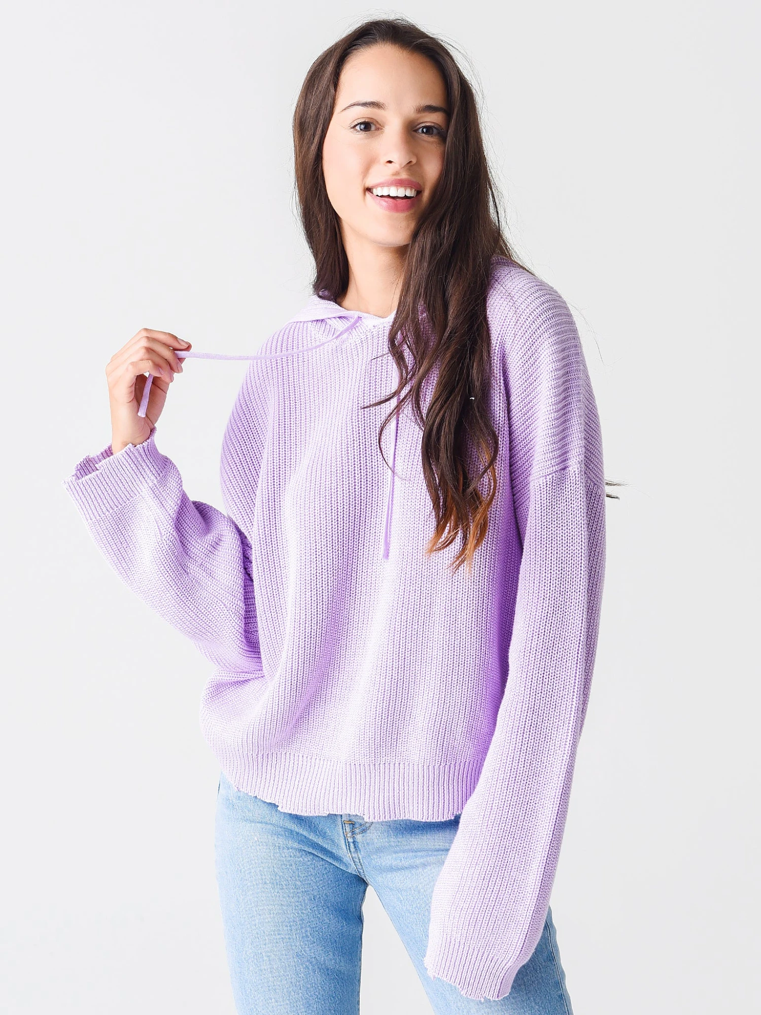 FEATURES:HoodieHigh Neckline with DrawstringsDropped ShoulderLong SleeveDistressed Cuffs & HemKnit Fabrication100% CottonRelaxed FitModel is wearing size Small hoodie.Model’s Measurements: Height: 5’8″ | Bust: 32C | Waist: 24″ | Hips: 34″ | Dress Size: 0-2 (US)