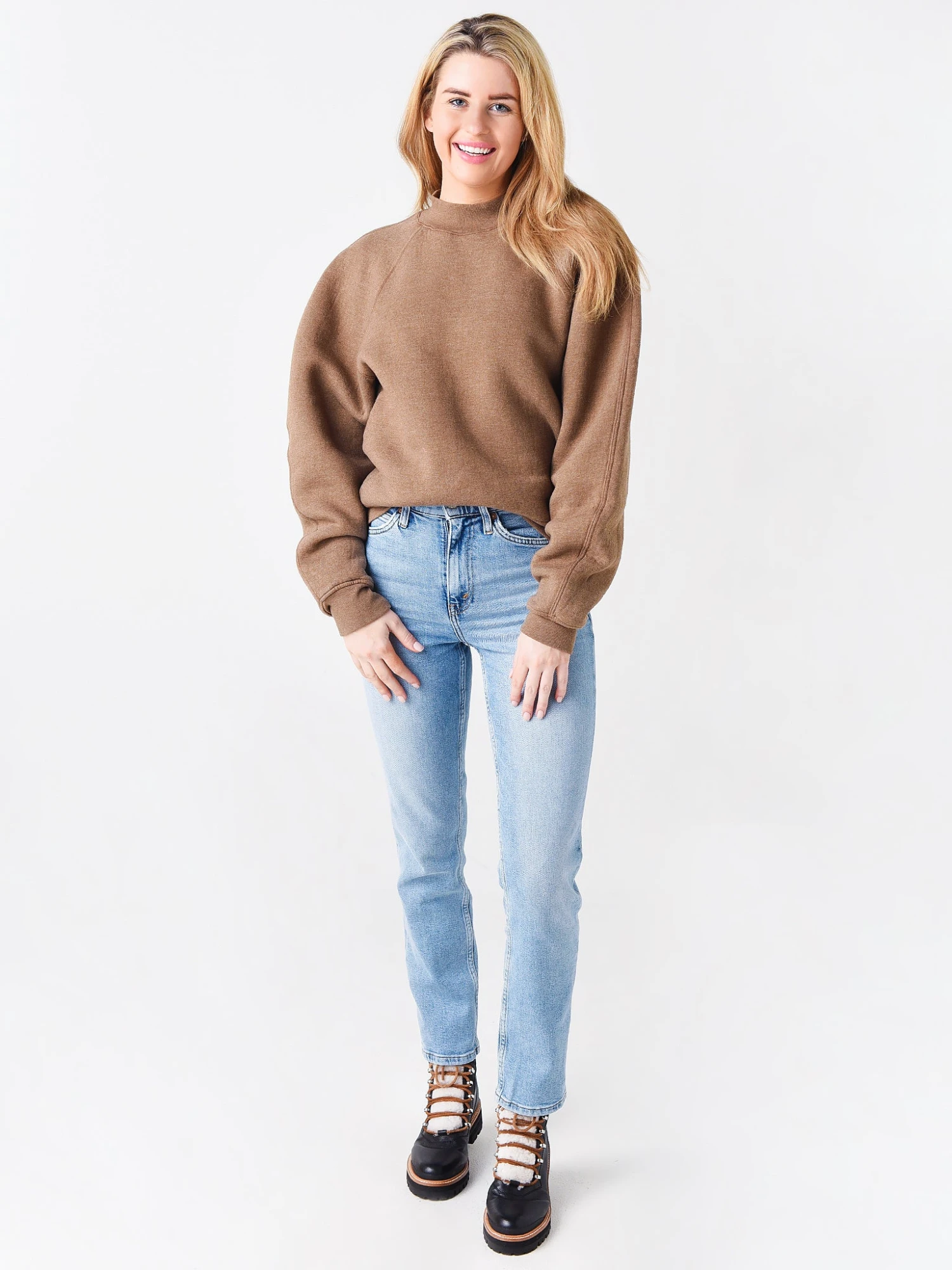 FEATURES:SweatshirtMock TurtleneckRaglan Long SleeveBanded Cuffs and HemPullover StyleSuper Soft100% CottonModel is wearing size Small sweatshirt.Fondant Heather, Wired: Model’s Measurements: Height: 5’9″ | Bust: 34B | Waist: 26″ | Hips: 37″ | Dress Size: 2-4 (US)Toffee Heather: Model’s Measurements: Height: 5’10” | Bust: 32B | Waist: 26″ | Hips 36″ | Dress: 4 (US)
