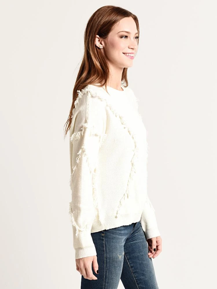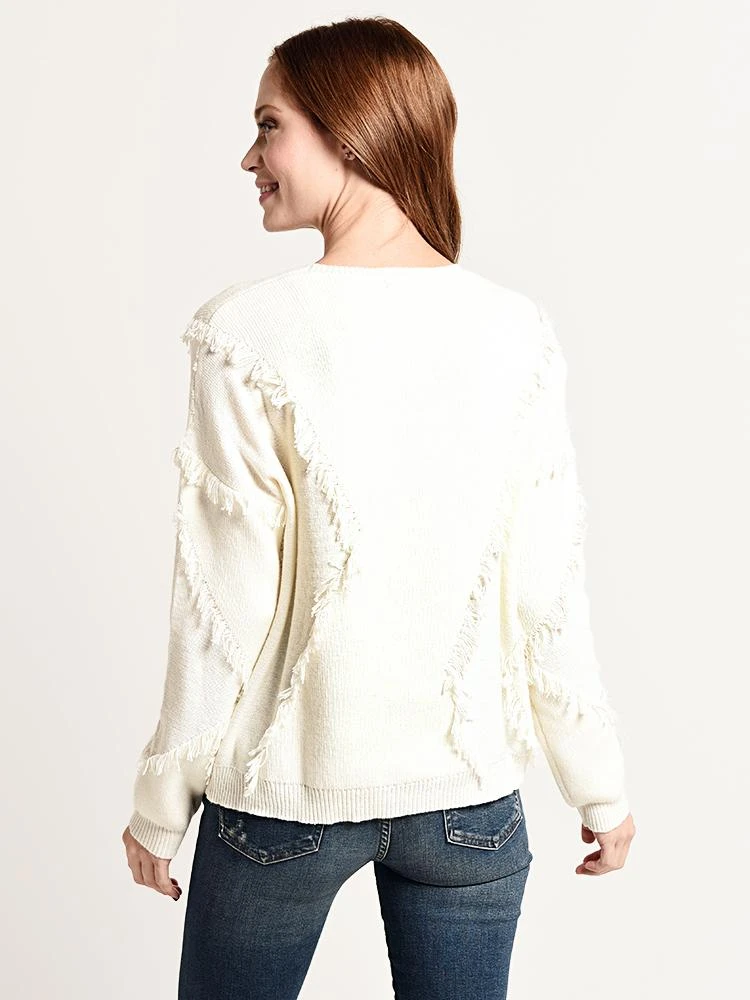 FEATURES:Crew neck Dropped shoulder seams Ribbed trim at neck, cuff and hem Oversized fit Asymmetrical fringe detail 60% cotton, 30% nylon, 10% wool Dry clean only Imported Styled with Citizens of Humanity jeans Style # 1416C-989 and Joie boot Style # RALEAN. Model is wearing size small sweater and size 26 jean.