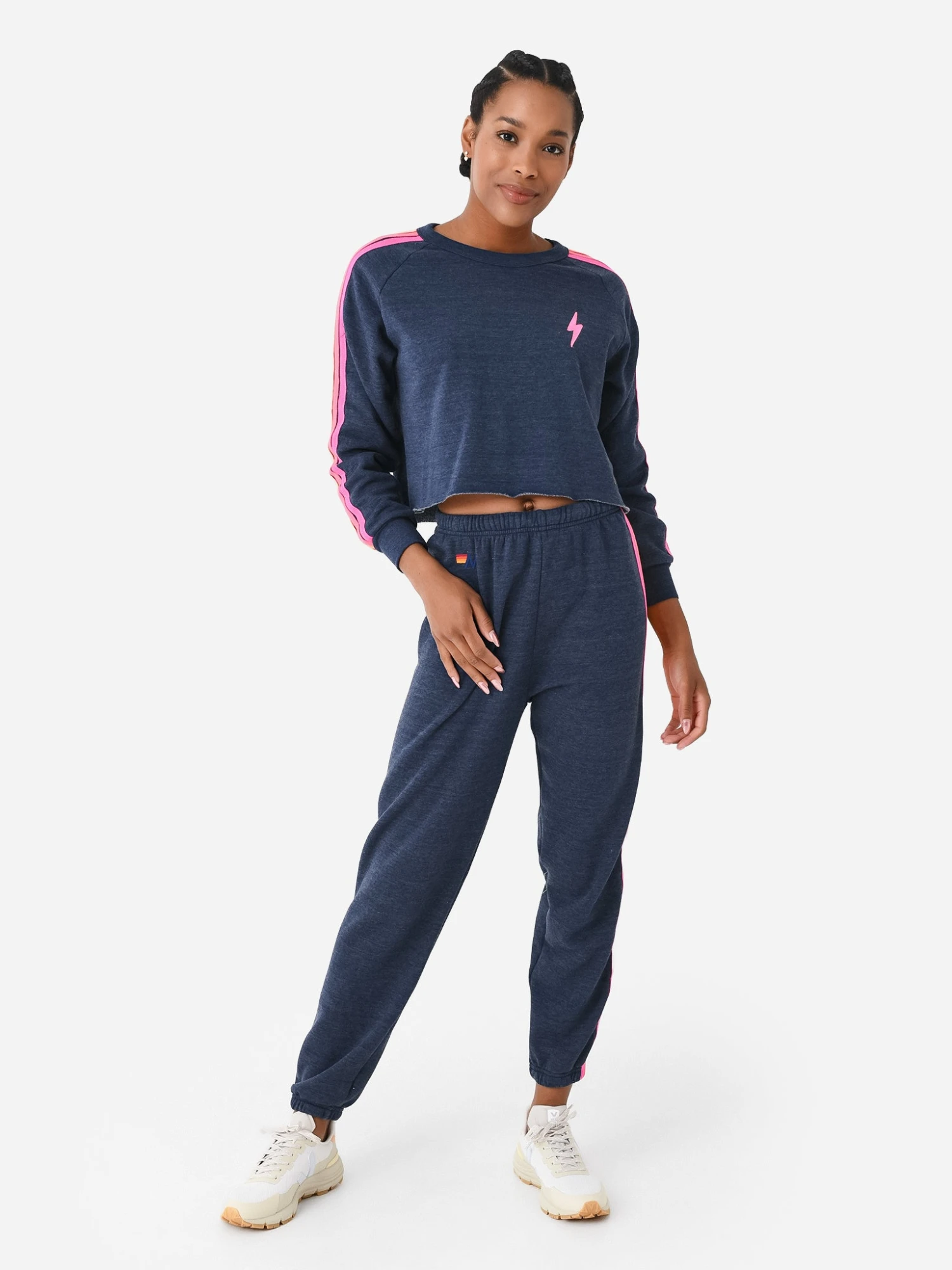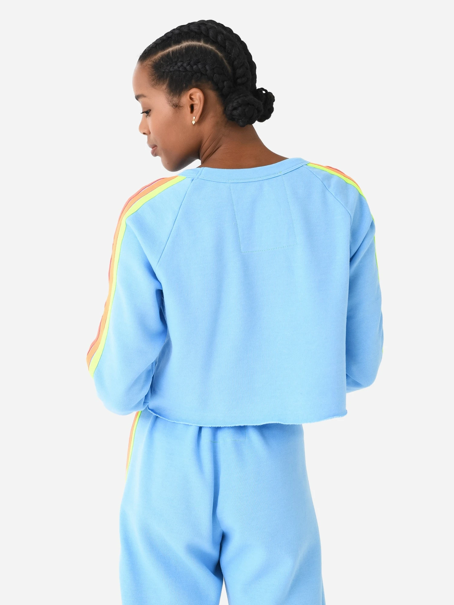 FEATURES:SweatshirtCrew NeckEmbroidered Lightening BoltLong Sleeve with Stripe DetailSlight Cropped SilhouetteRaw Edge HemSoft Fabrication50% Cotton, 37% Polyester, 13% RayonClassic FitModel is wearing size Small sweatshirt.Model’s Measurements: Height: 5’10” | Bust: 34B | Waist: 25.5″ | Hips: 36.5″ | Dress Size: 2 (US)