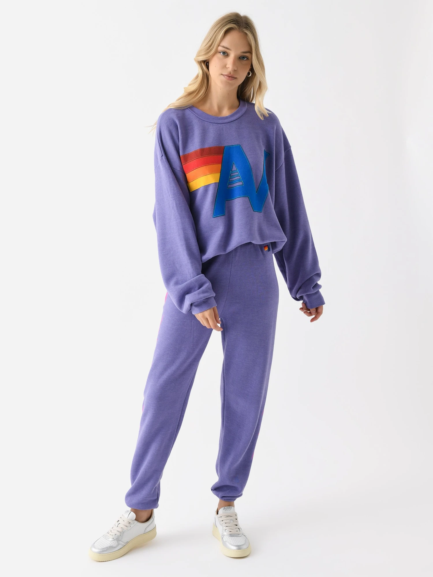 An oversized crew sweatshirt made from ultra-soft fabric with a colorful embroidered brand logo.