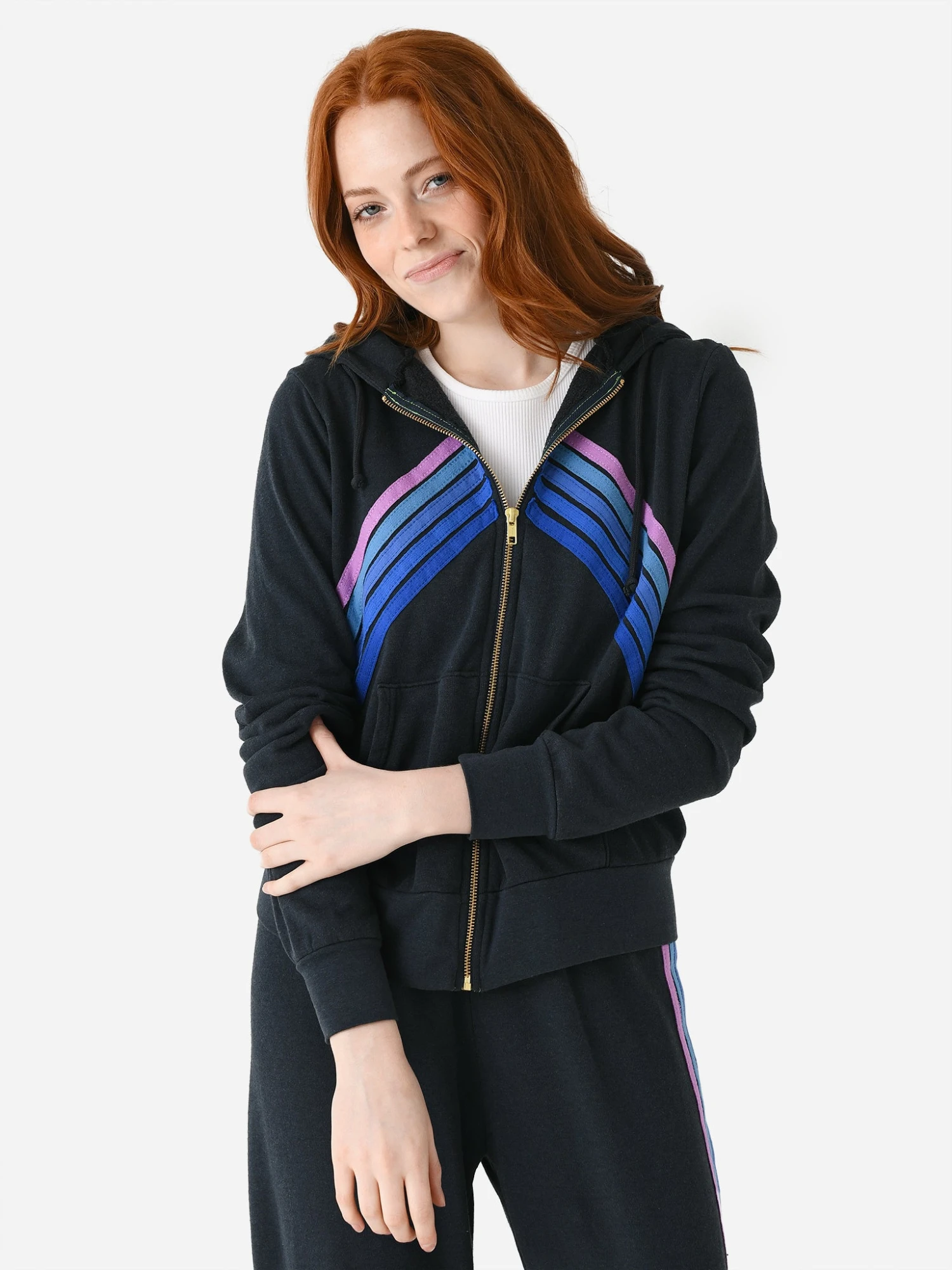 FEATURES:Drawstring HoodEmbroidered StripesKangaroo PocketsFull Zip ClosureBanded Cuffs and HemTri-Blend Fabrication50% Cotton, 37% Polyester, 13% RayonRelaxed FitModel is wearing size Small hoodie.Model’s Measurements: Height: 5’8.5″ | Bust: 32B | Waist: 26.5″ | Hips: 35.5″ | Dress Size: 2 (US)