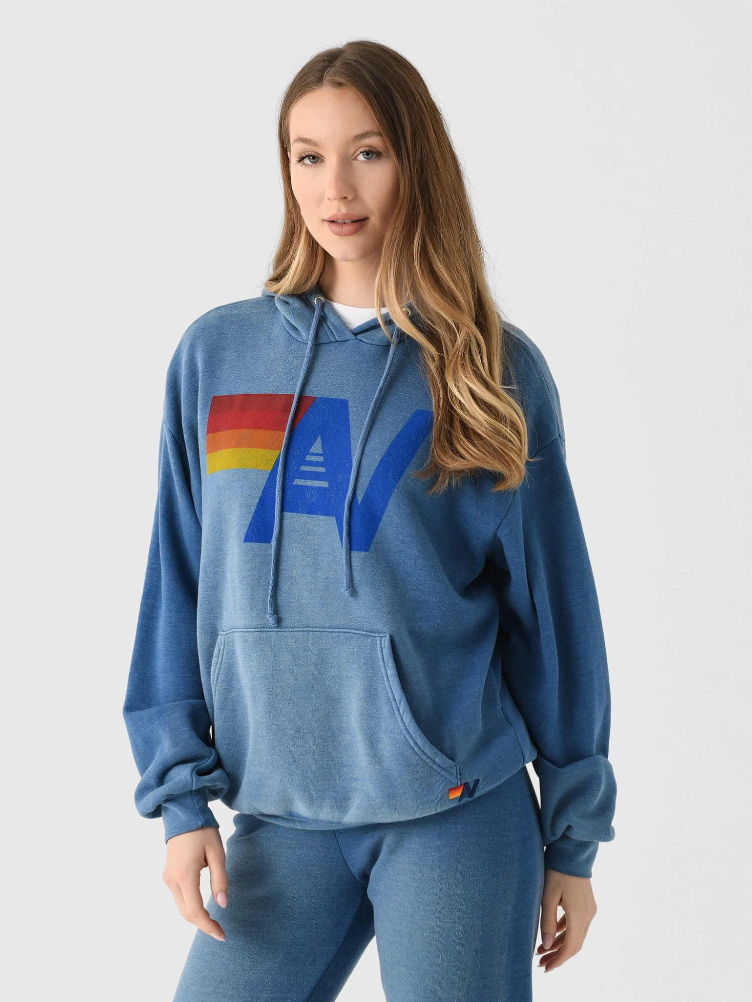 A cozy fleece pullover hoodie with a relaxed design featuring a vintage-inspired Aviator Nation logo.