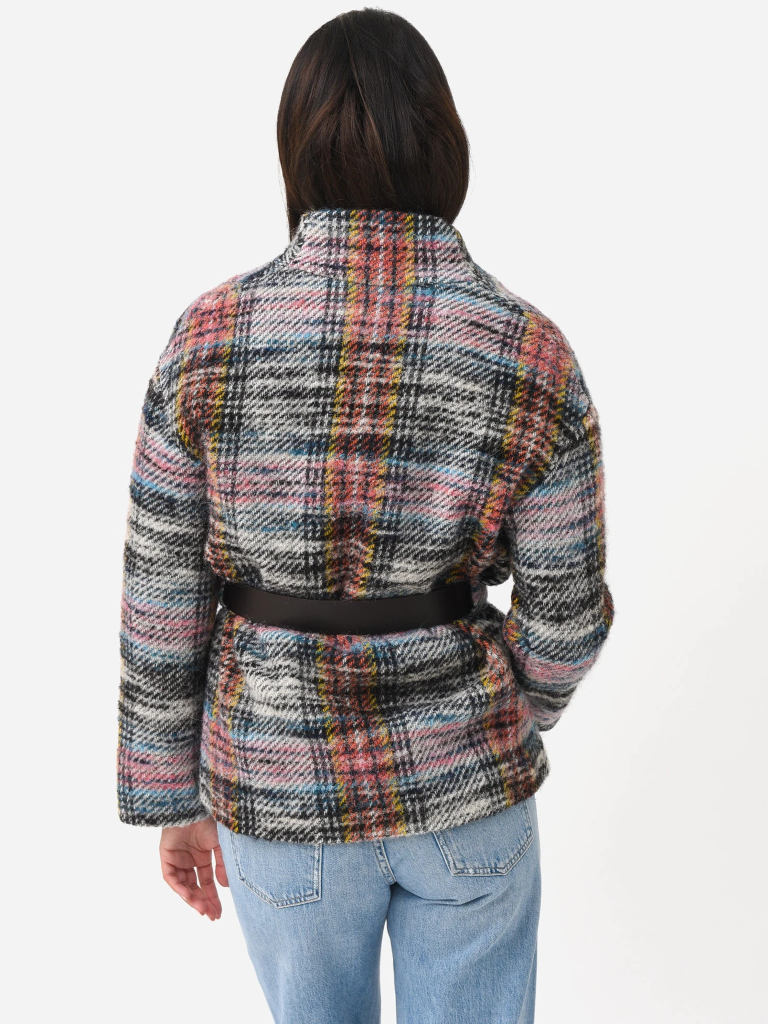 Wool-blend open-front jacket with a belted waist.
