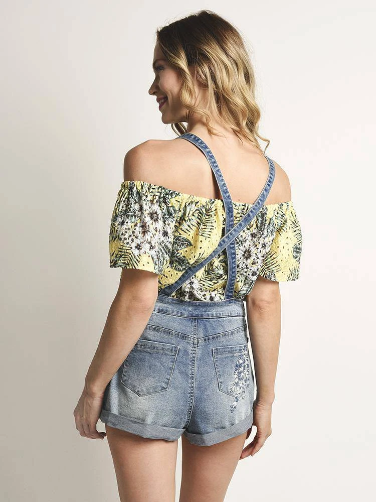 FEATURES:68% Cotton 26% Polyester 4.5% Viscose 1.5% SpandexRolled hemDistressed Side pockets Side button closureImportedModel is wearing size small Romper.