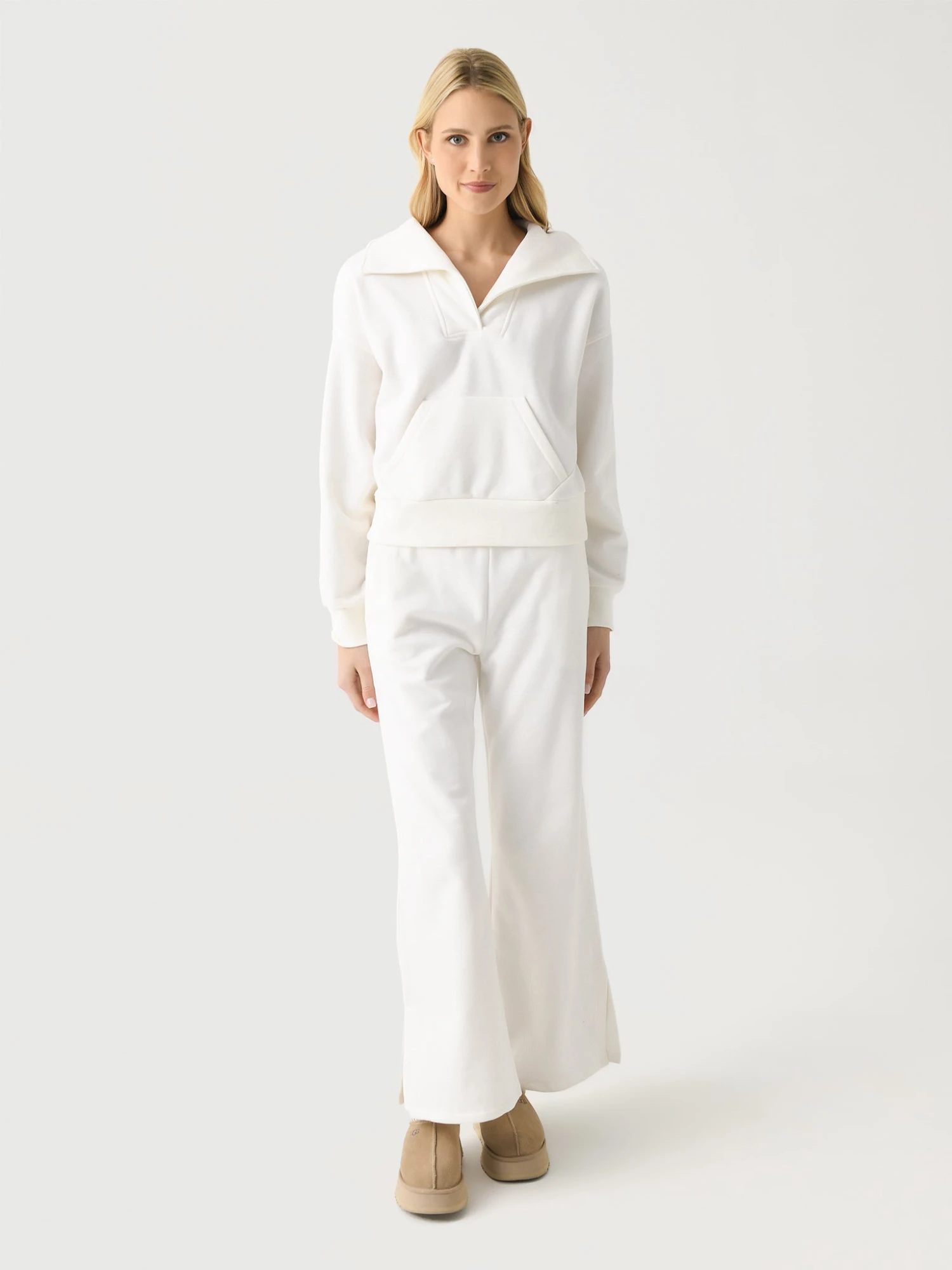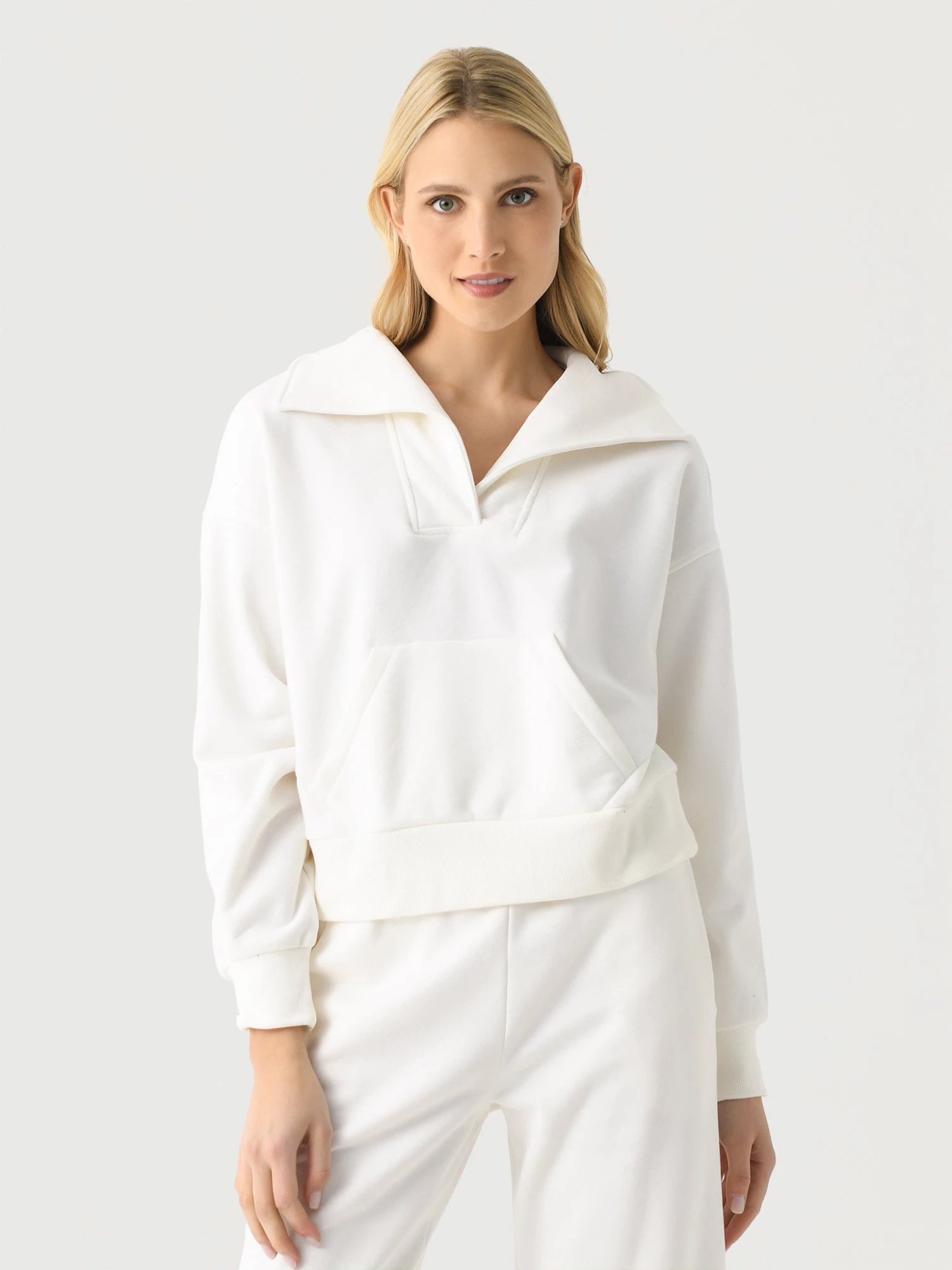 FEATURES:Spread CollarV-NecklineDropped ShoulderKangaroo PocketBanded Cuffs and HemFleece Fabrication67% Cotton, 33% PolyesterRelaxed FitModel is wearing size Small pullover.Model’s Measurements: Height: 5’10.5″ | Bust: 32B | Waist: 25.5″ | Hips: 36.5″ | Dress Size: 0-2 (US)