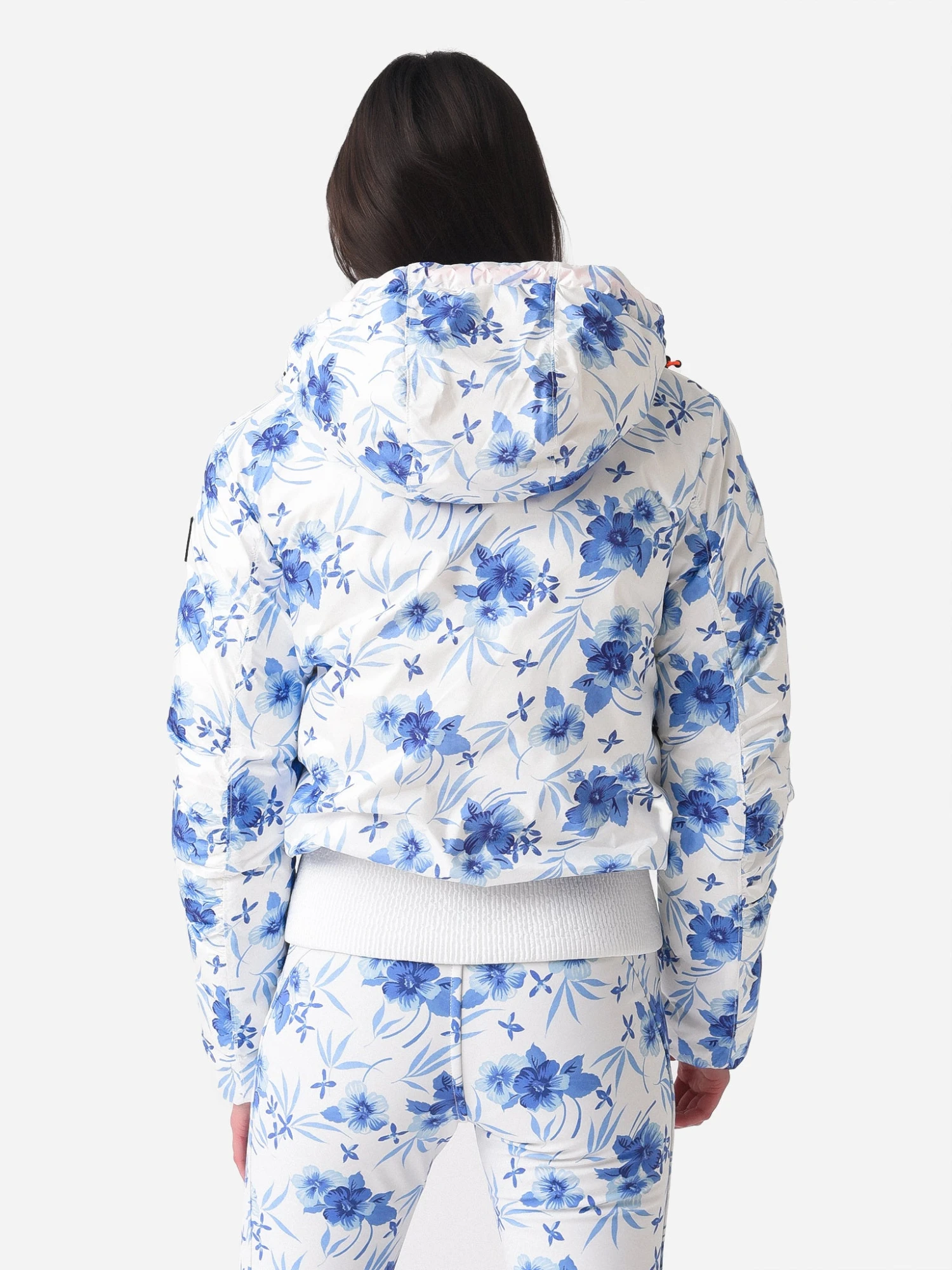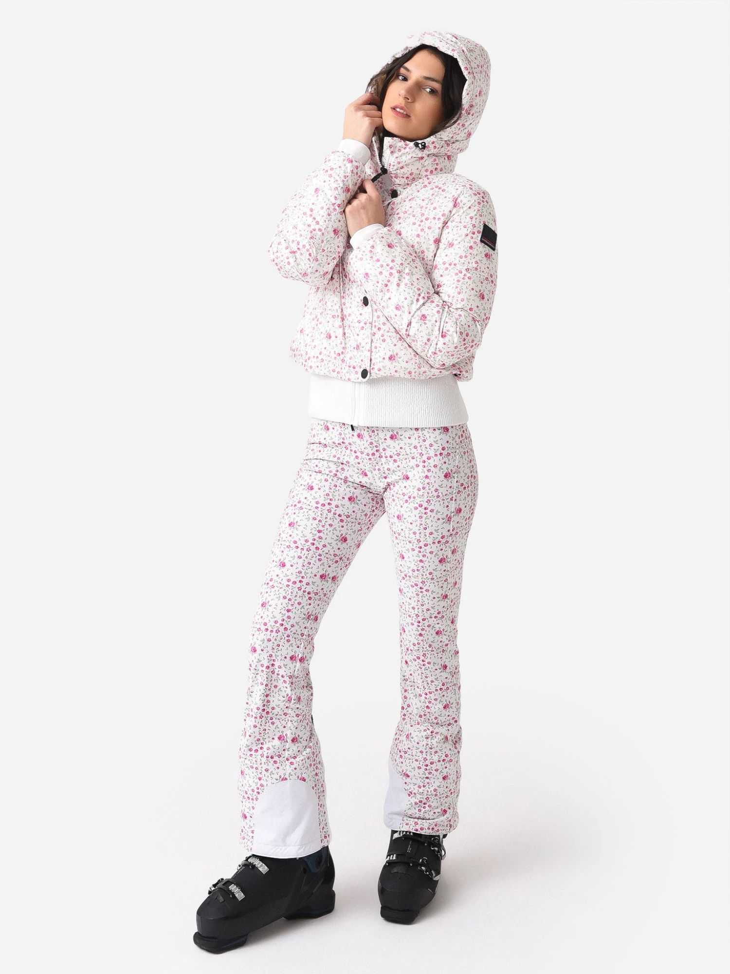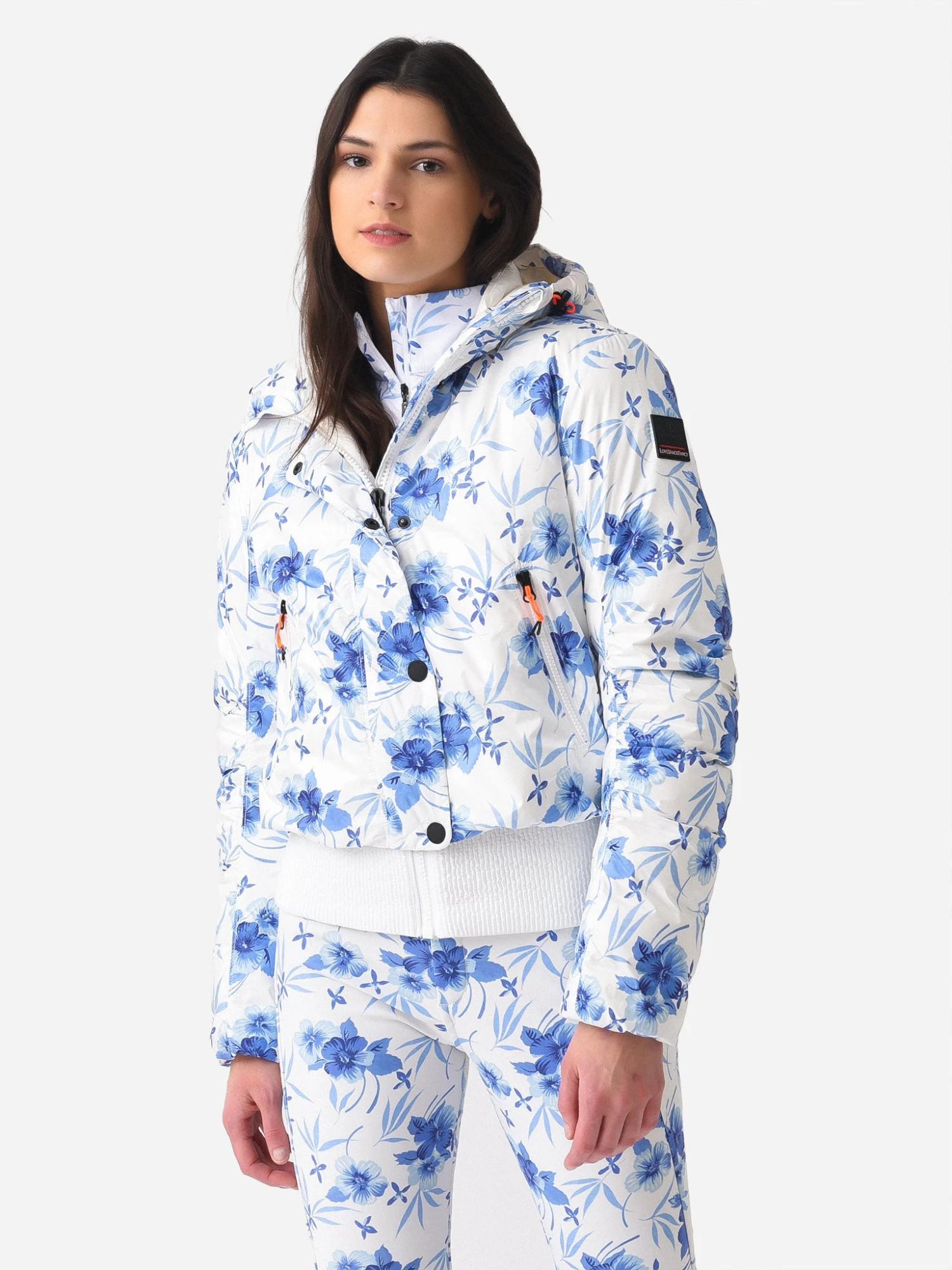Down-insulated jacket with an adjustable hood, built-in powder skirt, and waterproof finish.