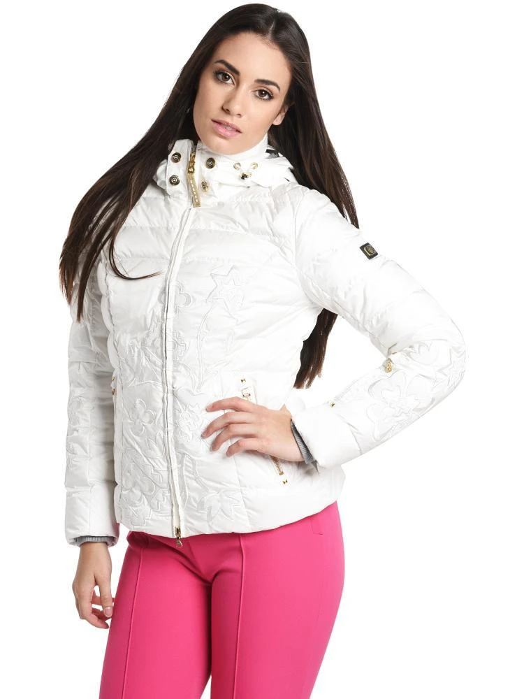 FEATURES:Removable drawstring hood, adjustable pocketBanded collar with snapsTwo way zipperLateral zipper pockets, sleeve lift pass zipper pocket, and interior zipper pocket Sleeves with striped embroidered cuffsSnow guardGold-colored metal detailsReflective floral embroideryWater column 20,000 mm, breathability 20,000 g/m²/24hLining: 100% polyesterFilling: 90% goose down, 10% goose feathersLength: 24.8 in 100% polyamideStyled with Bogner first layer Style # 5156-4144 and pant Style # 1171-4478. Model is wearing size 6 jacket, size small first layer and size 6 pant.