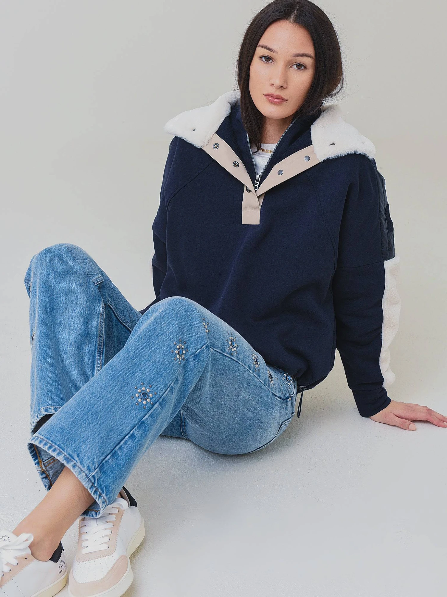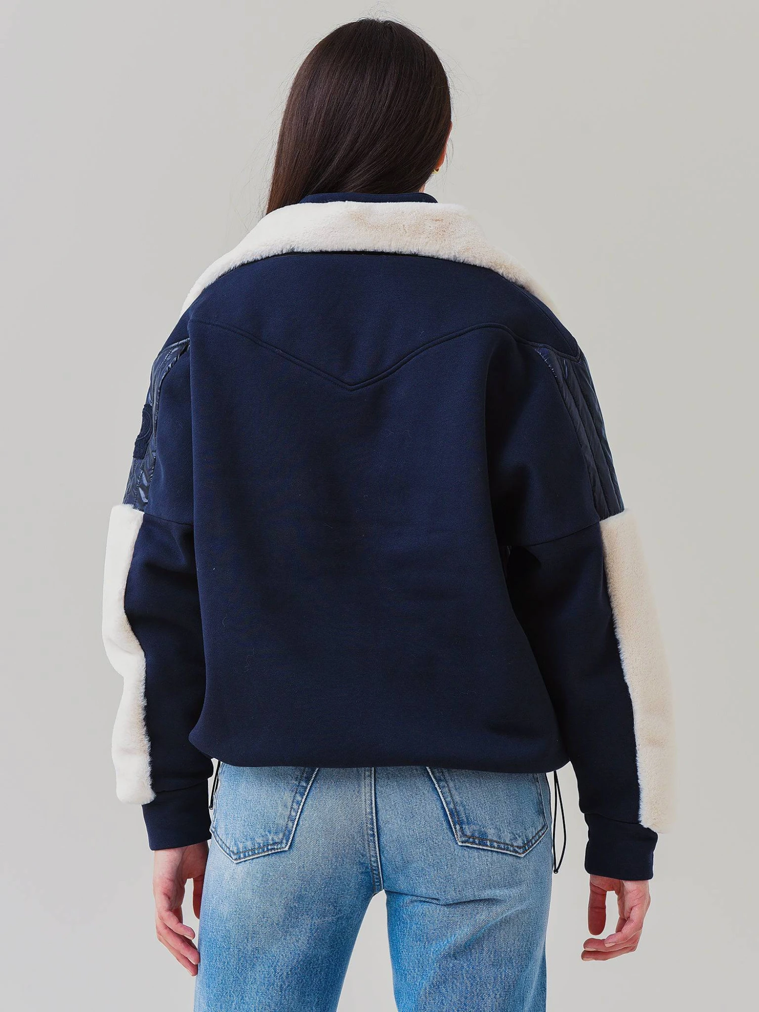 FEATURES:SweatshirtInserted Stand-Up Zip Collar w/ Faux Fur Turn-Down Snap Button CollarDropped ShoulderLong Sleeve w/ Banded CuffsNylon Shoulder Inserts and Faux Fur DetailElastic Hem w/ Gripper ElasticThermal PropertiesSoft FabricationShell 1: 90% Cotton, 10% Polyester | Shell 2: 100% PolyesterRelaxed FitModel is wearing size Small sweatshirt.Model’s Measurements: Height: 5’9″ | Bust: 32B | Waist: 24″ | Hips: 36″ | Dress Size: 2 (US)