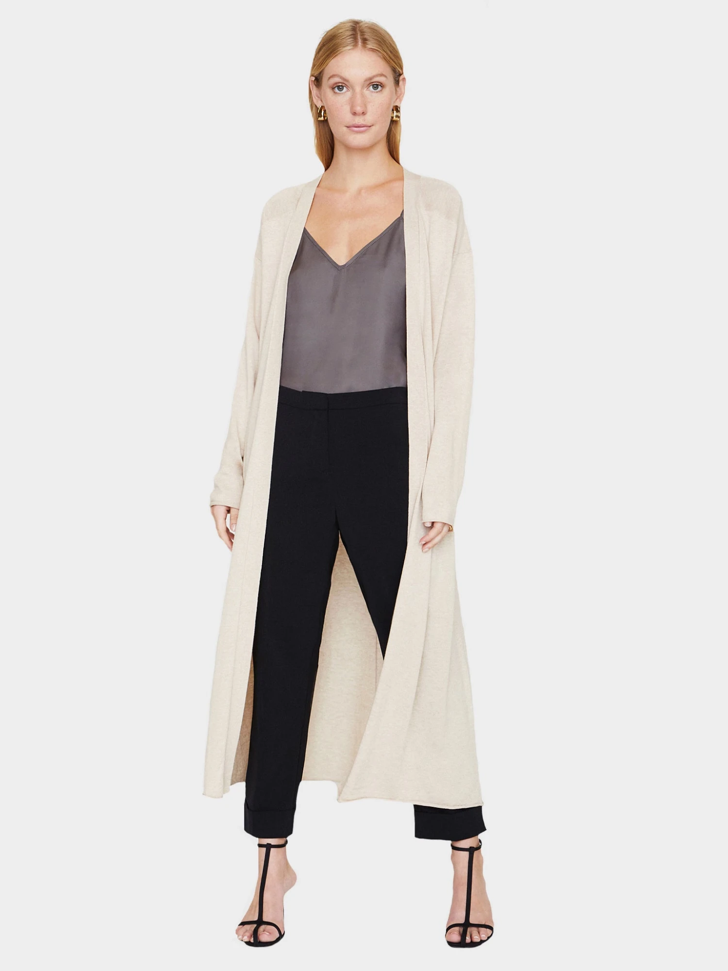 FEATURES:DusterOpen FrontRobe-LikeRolled Trim on Hem and CuffsStraight, Slightly Flowy SilhouetteMaxi Length55% Silk, 45% Cotton