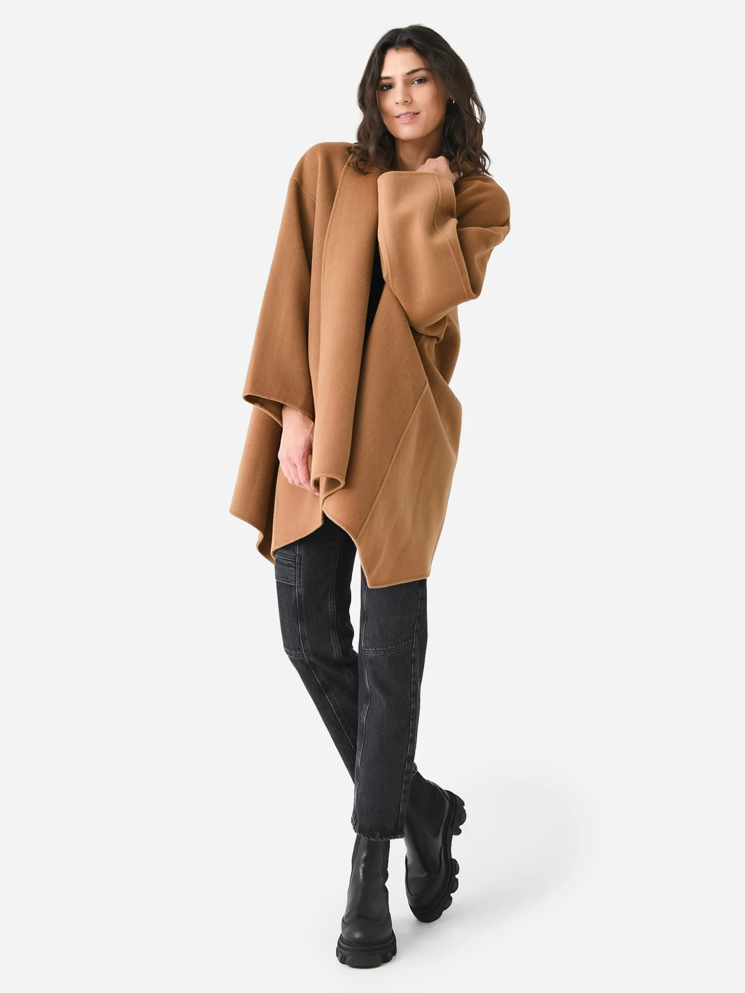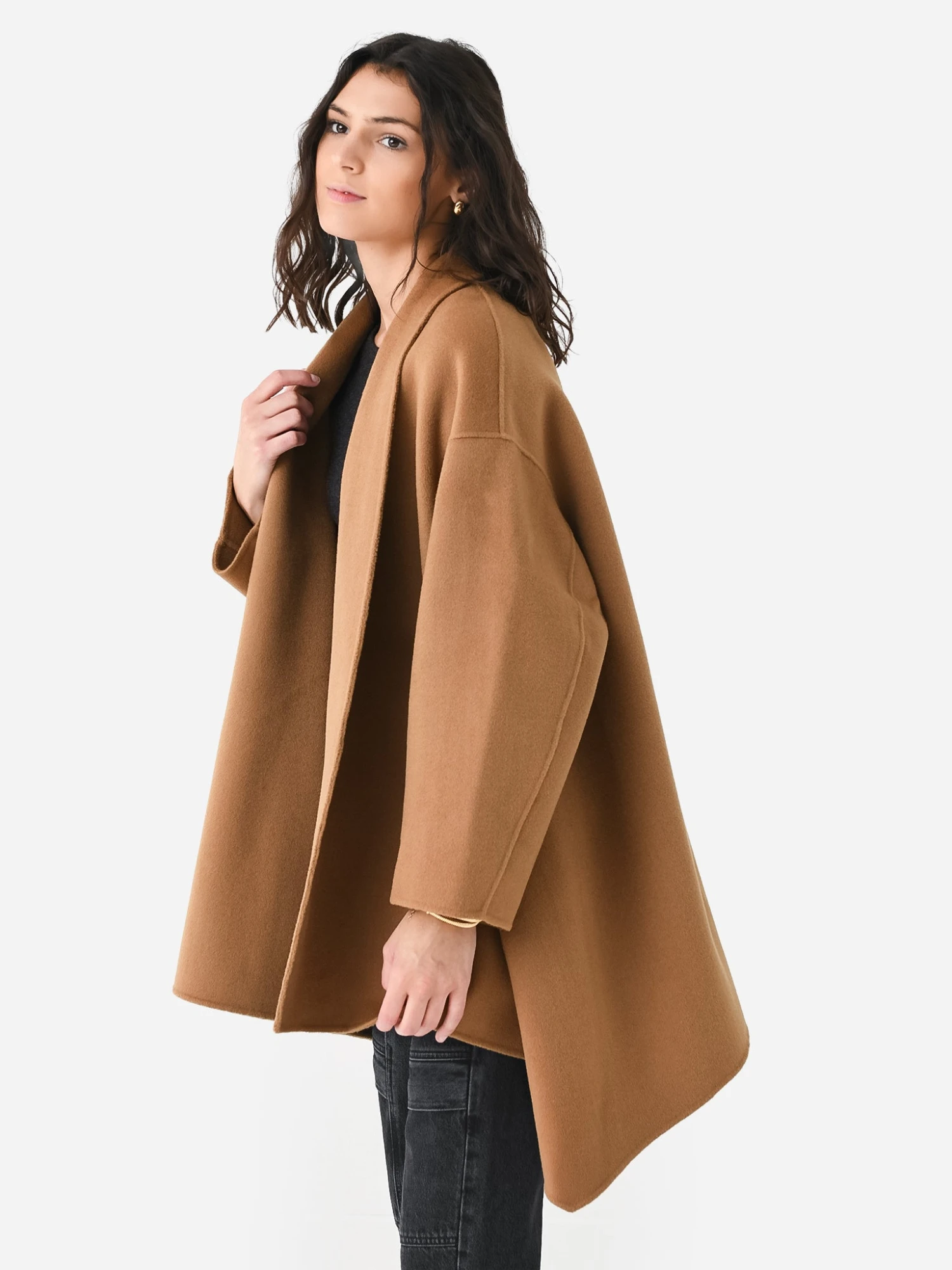 Wrap-style coat with an open, draped silhouette constructed from luxurious wool.
