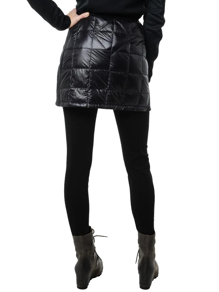 FEATURES:Feather-Light 10D outer fabric allows for aspects of the down fill to show through, yet it is still fully abrasion resistantQuilt-through design to reduce pack sizeMid thigh length for style and moderate coverageTensile-Tech side panels for extended comfort and maximized fitInvisible zipper on back left side panel for easy on and offStretch Lycra binding acts as a thin waistband for optimal performanceInternal left stretch mesh pocketSkirt length: 16 Slim fit800 Fill Power Hutterite White Goose DownImportedStyled with Spyder sweater Style # 158284, Three Dot leggings Style # HB638 and Sorel boots Style # NL1987. Model is wearing size small skirt, sweater and size 4 legging.