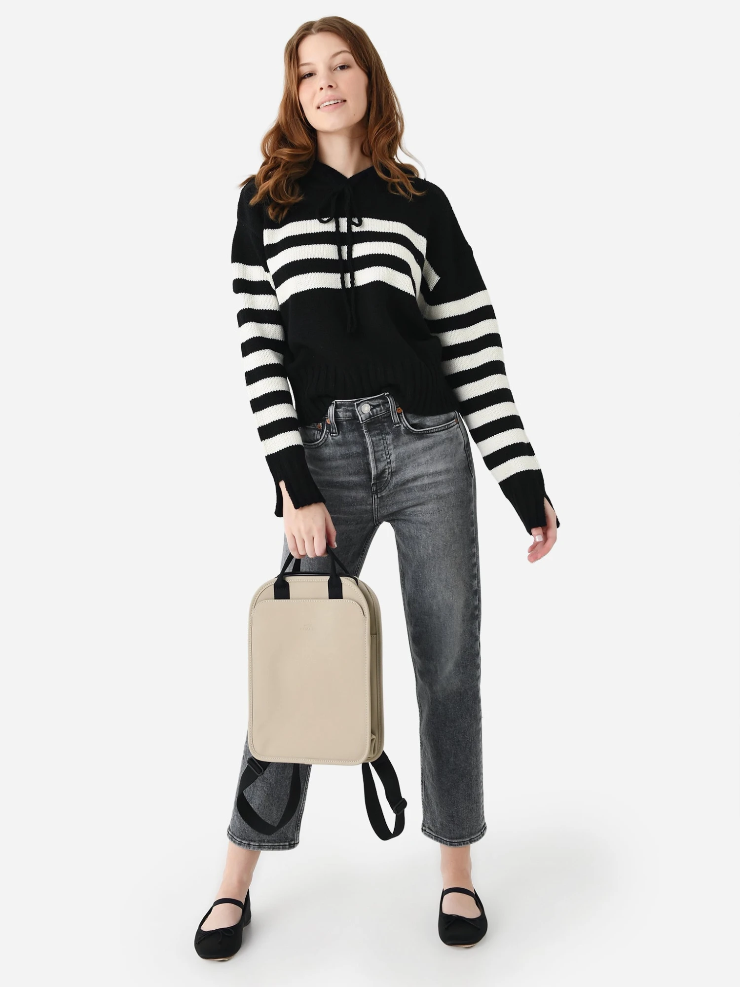 A hooded sweater made from a merino wool blend featuring contrast stripes.