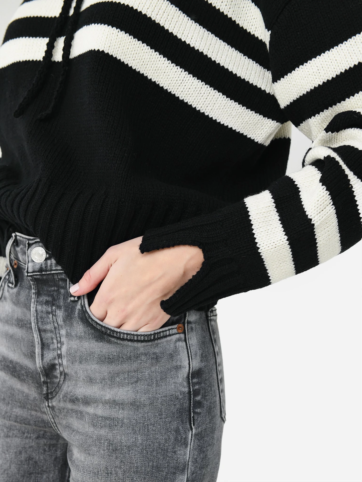 FEATURES:Drawstring HoodDropped ShoulderContrast StripesRibbed Cuffs and HemKnit Fabrication70% Merino Wool, 30% Recycled PolyesterRelaxed FitModel is wearing size Small hoodie.Model’s Measurements: Height: 5’10” | Bust: 32C | Waist: 24″ | Hips: 35″ | Dress Size: 0-2 (US)
