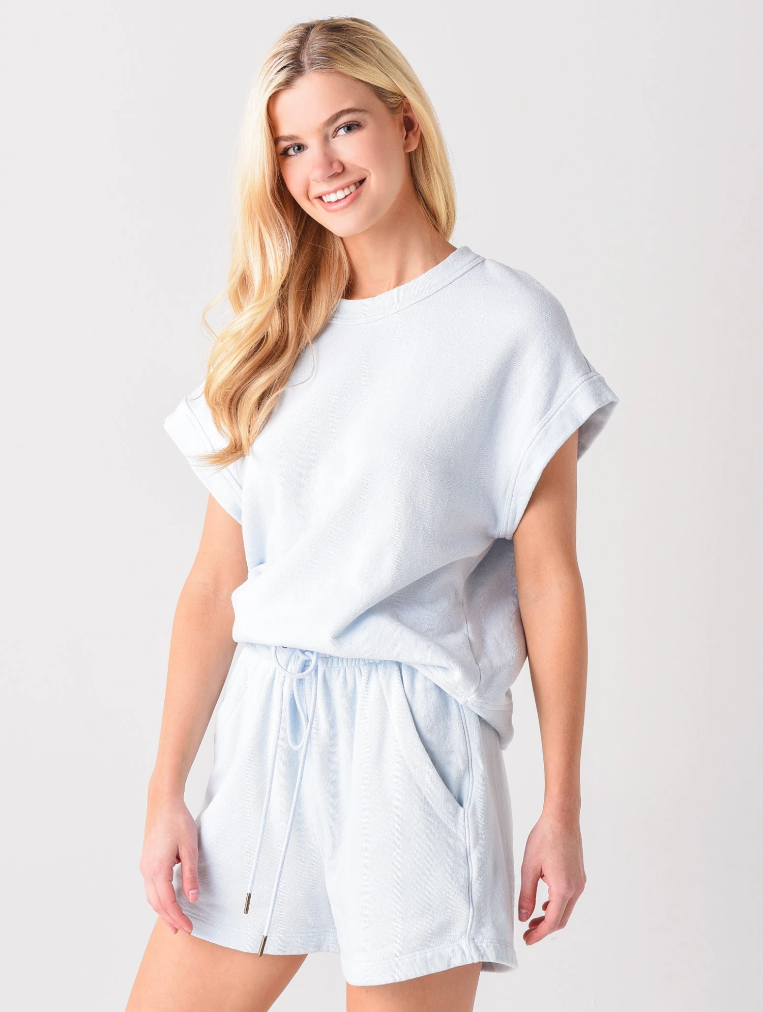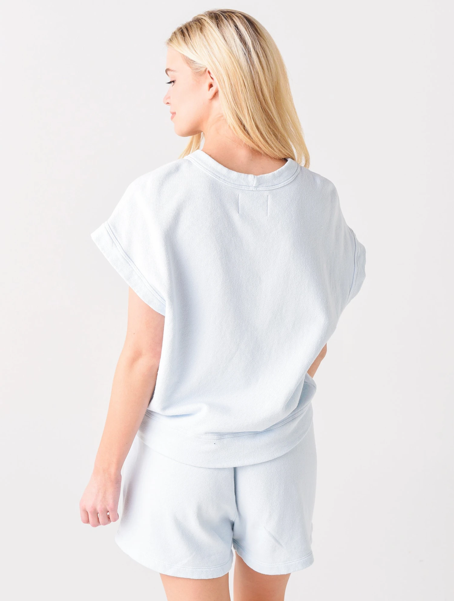 FEATURES:Crew neckShort, angled sleevesLightweight fleece fabric100% CottonMade in the USAModel is wearing size small sweatshirt and shortModel’s Measurements: Height: 5’9″; Bust: 32B; Waist: 24″; Hips: 36″; Dress: 4 (US)