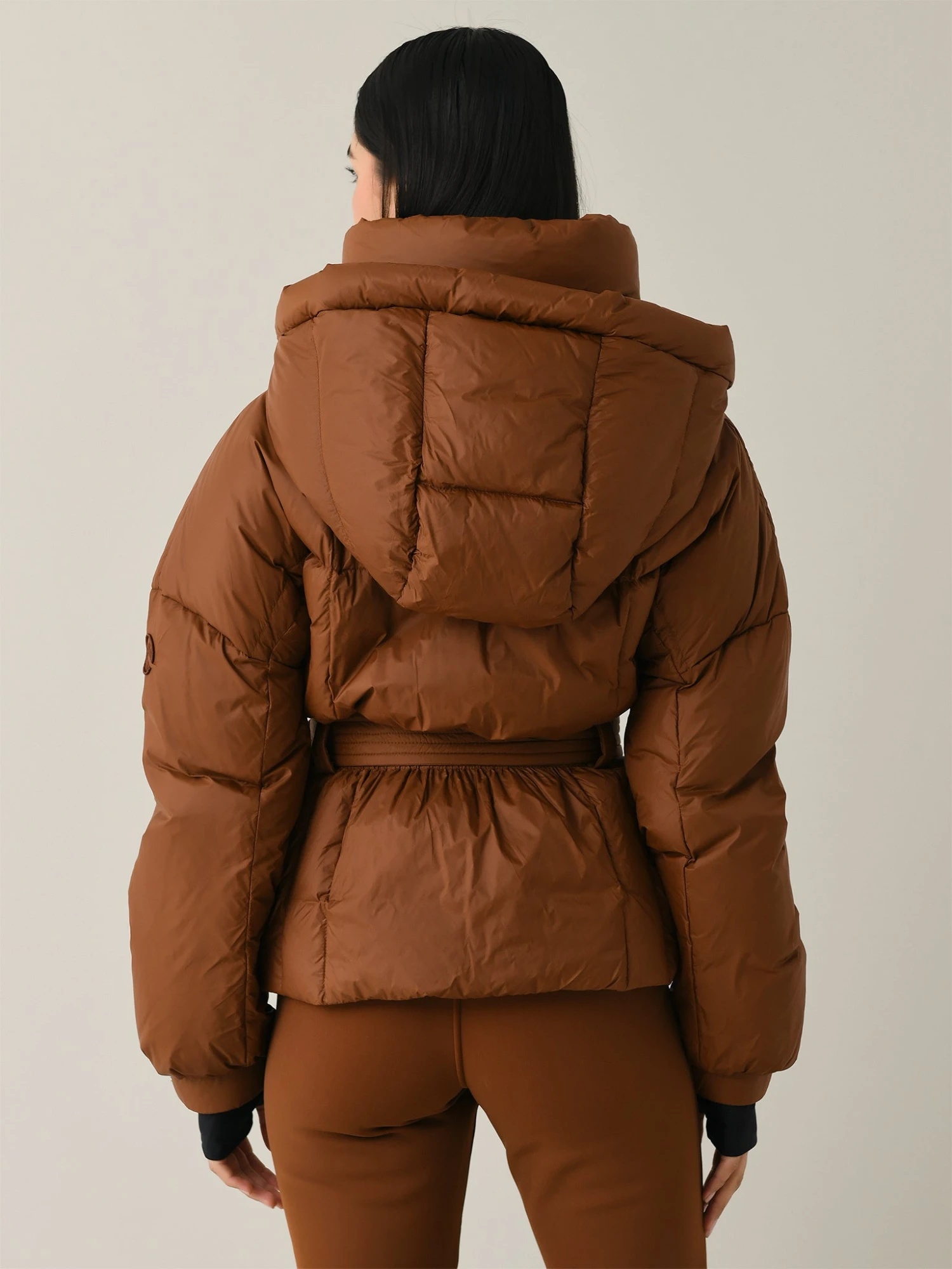 A soft matte jacket featuring a flattering belted waist and filled with RDS duck-down insulation.