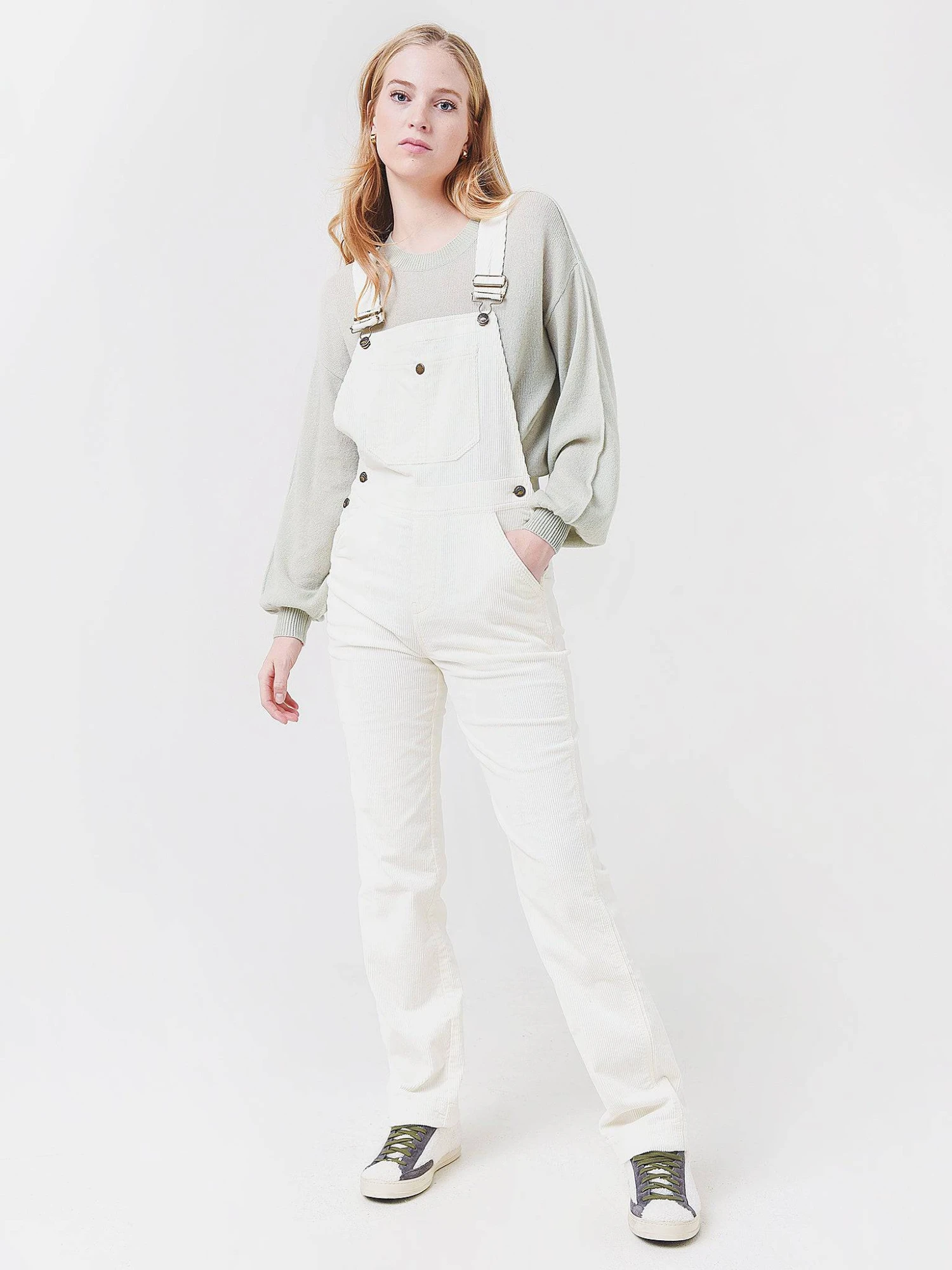 FEATURES:OverallAdjustable Shoulder StrapsFront PocketSide PocketsSide Button ClosureCorduroy Fabrication98% Organic Cotton, 2% SpandexInseam: 27 in.Slim FitModel is wearing size Small overall.Model’s Measurements: Height: 5’9.5″ | Bust: 32C | Waist: 26″ | Hips: 35.5″ | Dress: 2 (US)