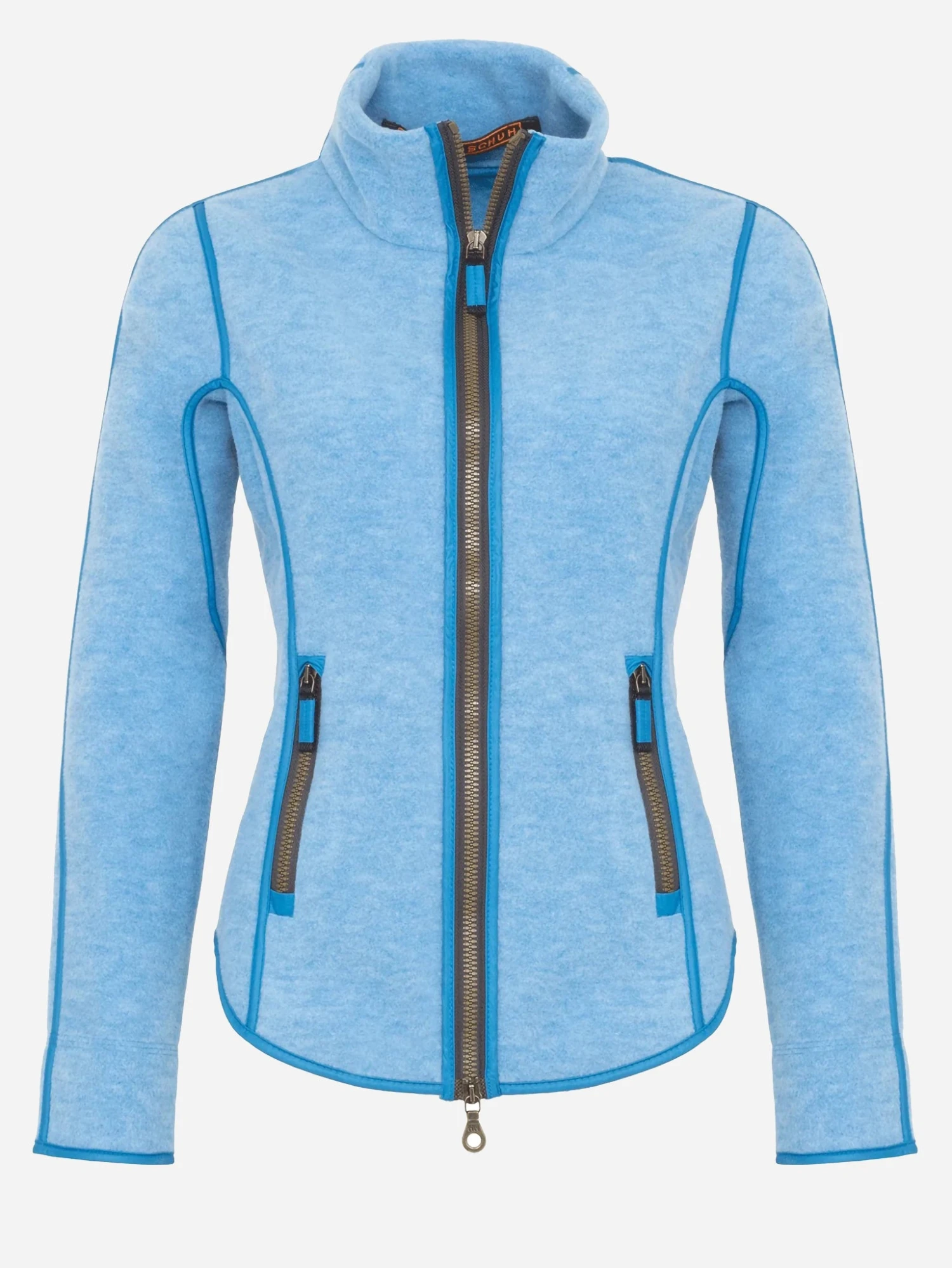 Polyester-wool blend jacket with passepoil seams and performance properties.