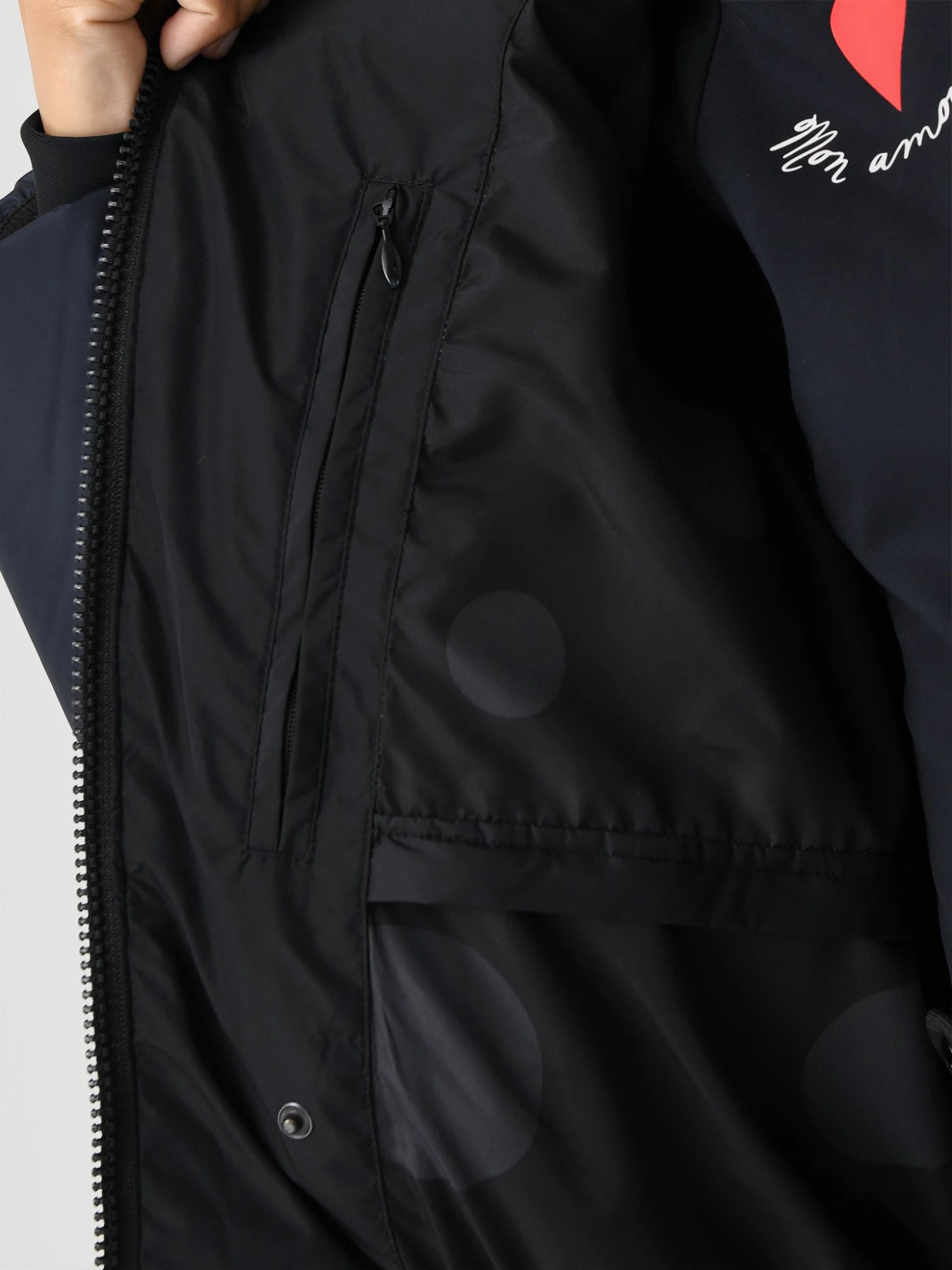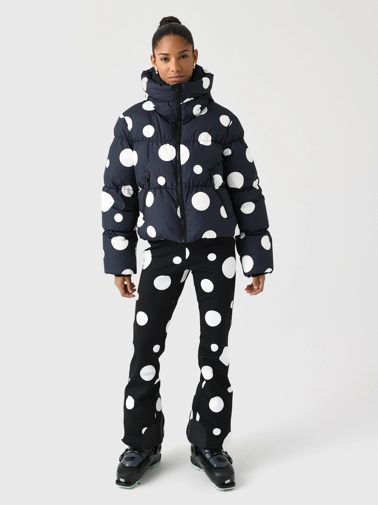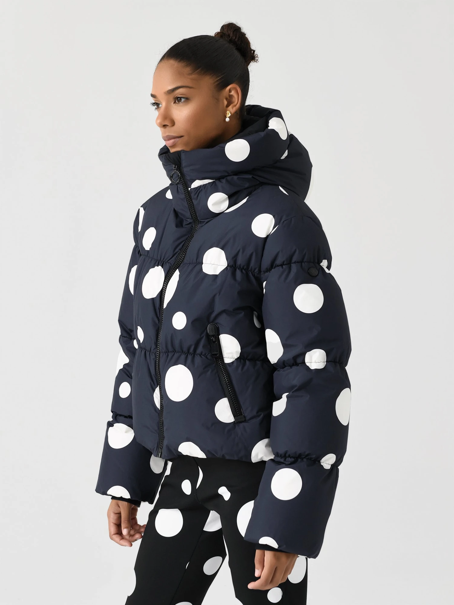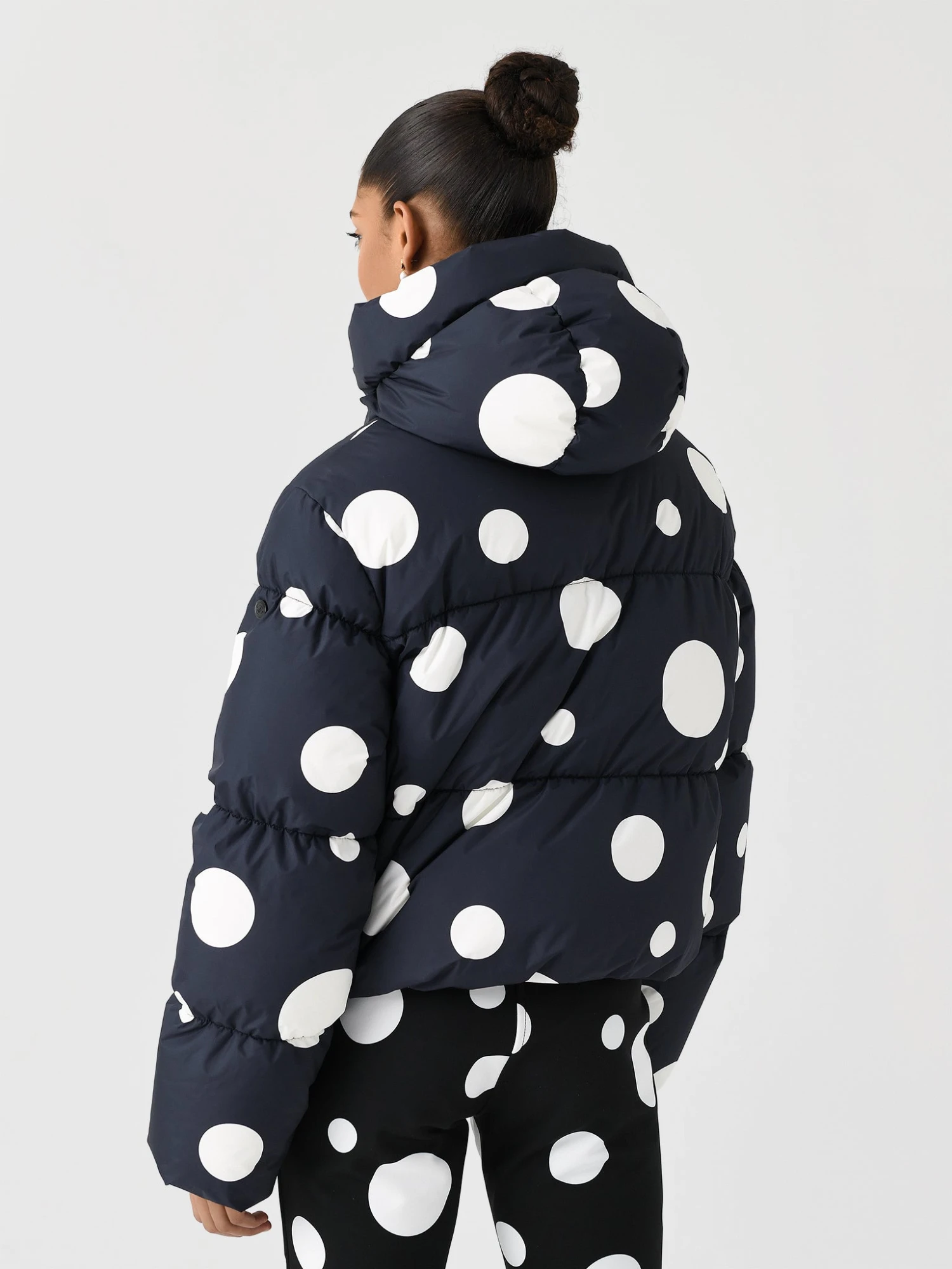 A polka dot-printed ski jacket made from sustainable, recycled polyester and filled with warm, RDS-certified down insulation.