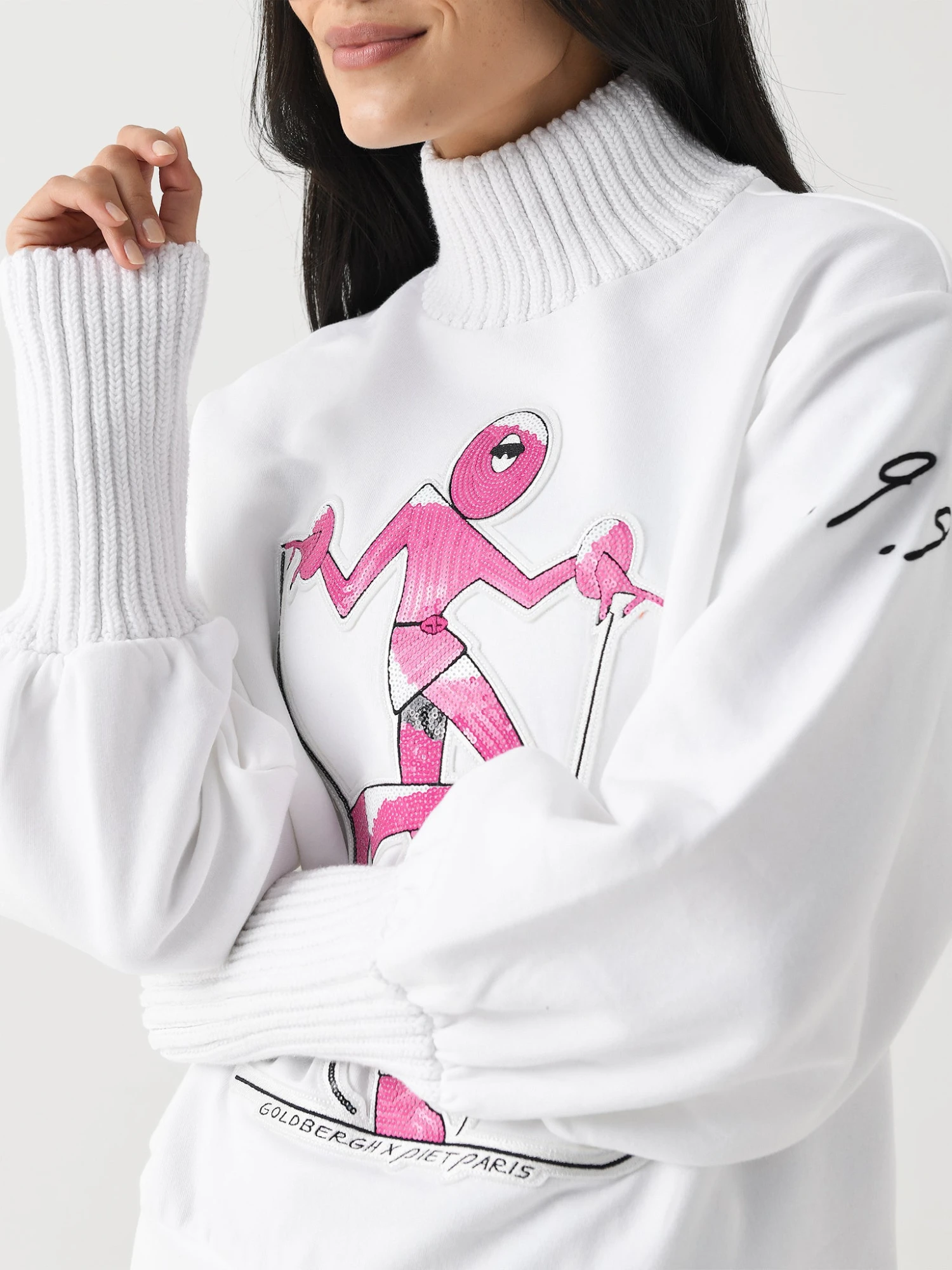 An oversized turtleneck sweater made from soft fleece featuring a custom Piet Paris fashion illustration graphic.