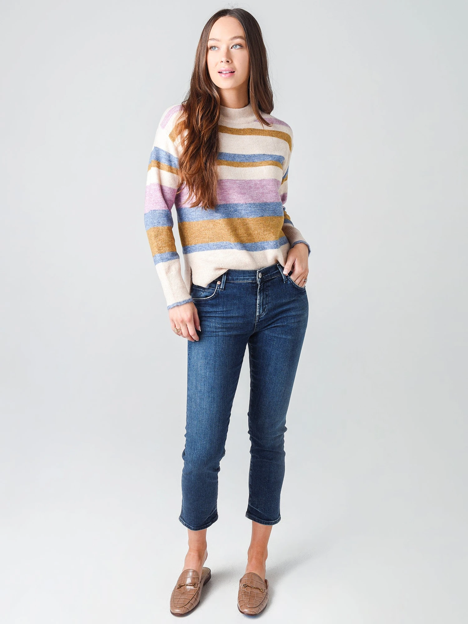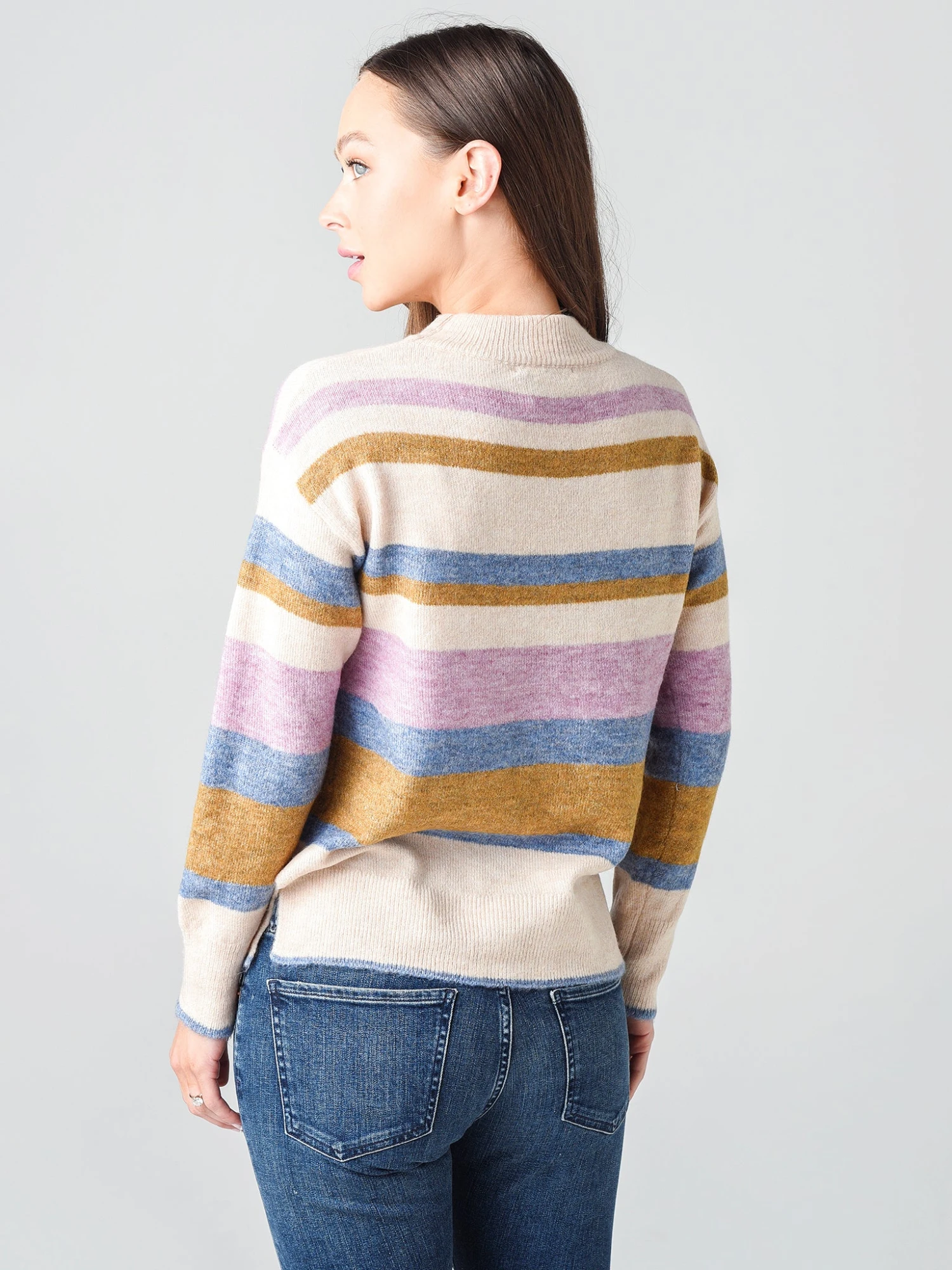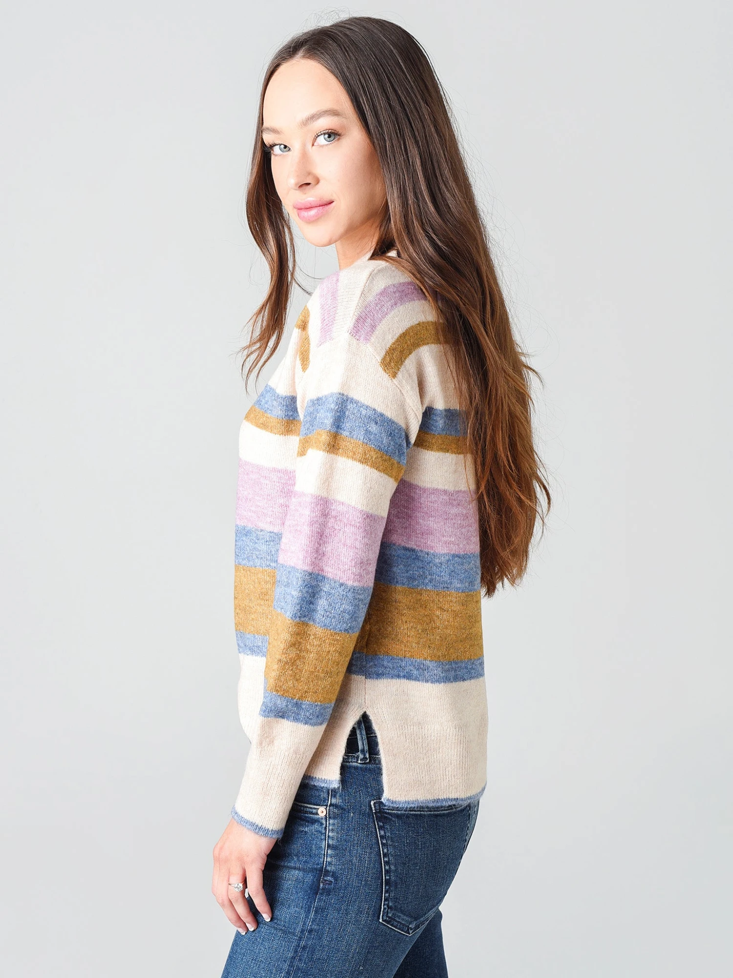 FEATURES:SweaterCrew NeckPulloverLong SleeveStriped DetailRelaxed FitViscose BlendModel is wearing size small sweater and size 26. Model’s Measurements: Height: 5’10.5″; Bust: 32C; Waist: 25″; Hips: 36″; Dress Size: 4 (US)