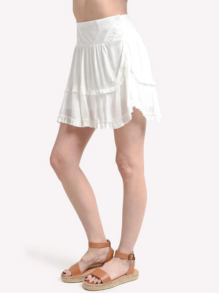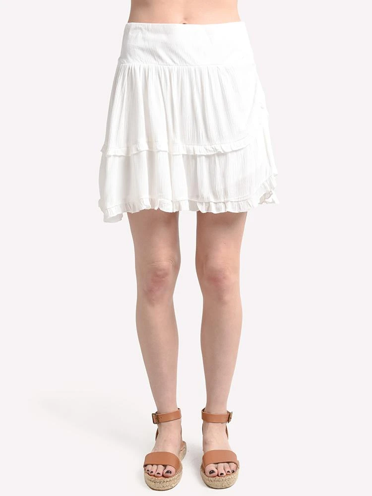 FEATURES:Flounce SkirtSmocked Detailing at BackRuffle DetailsTiered StylingCurved HemButton Closure on Hip100% Rayon, Lining: 100% PolyesterStyled with Jack top Style # JJ204290 and Soludos sandal Style # 1000341. Model is wearing size Small skirt and top.