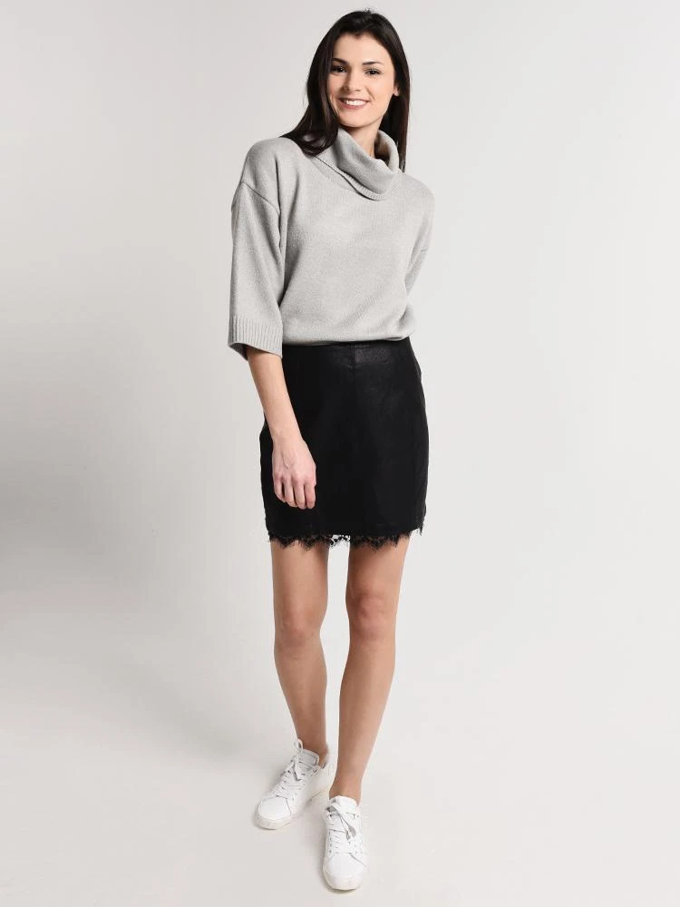FEATURES:Back hidden zipper Mid-thigh length Lace trim at hem 100% polyester lining 100% polyurethane Styled with Jack sweater Style # JI406428 and Zadig and Voltaire sneakers Style # WGAT1713F. Model is wearing size 4 skirt and size small sweater.