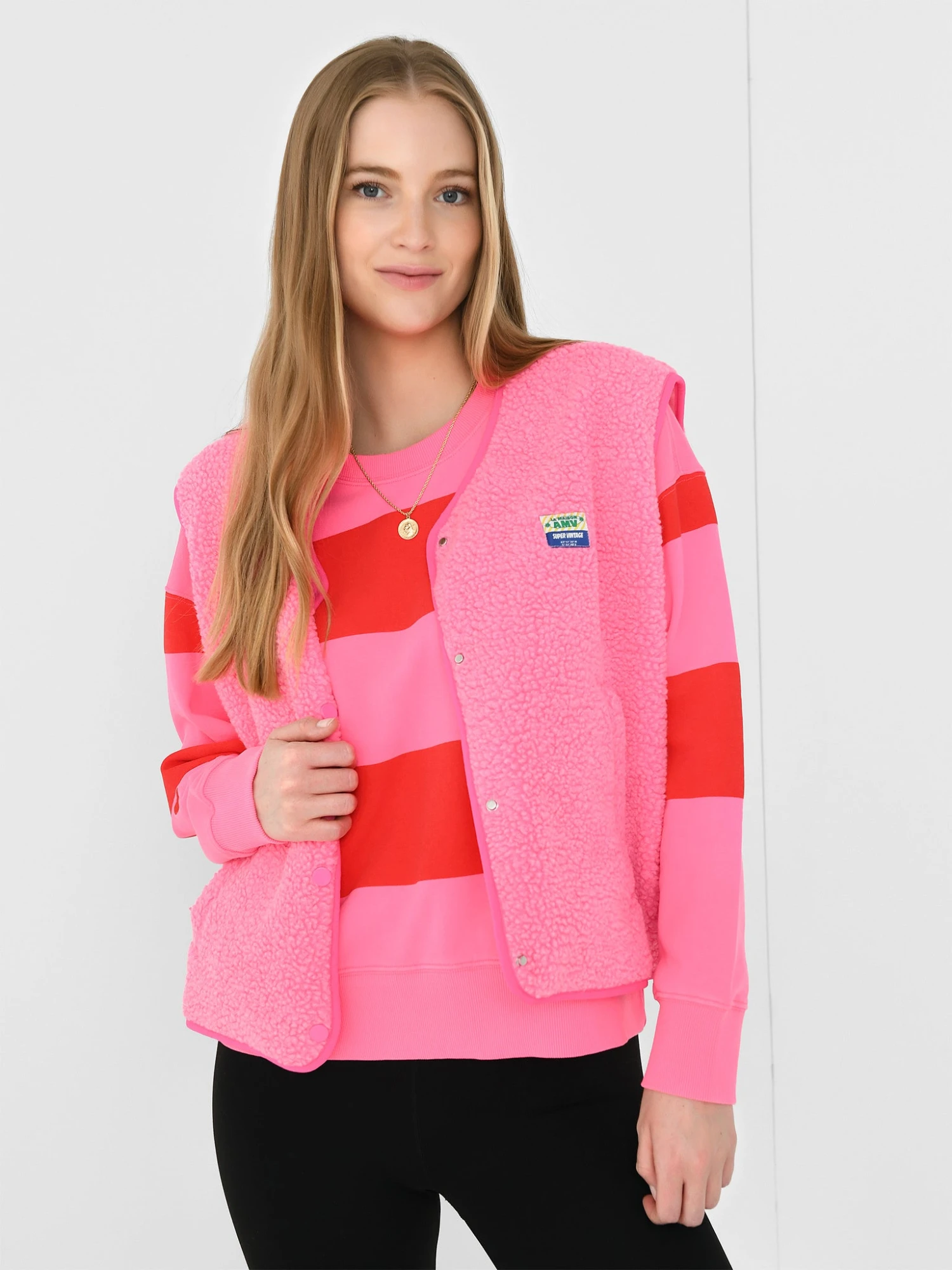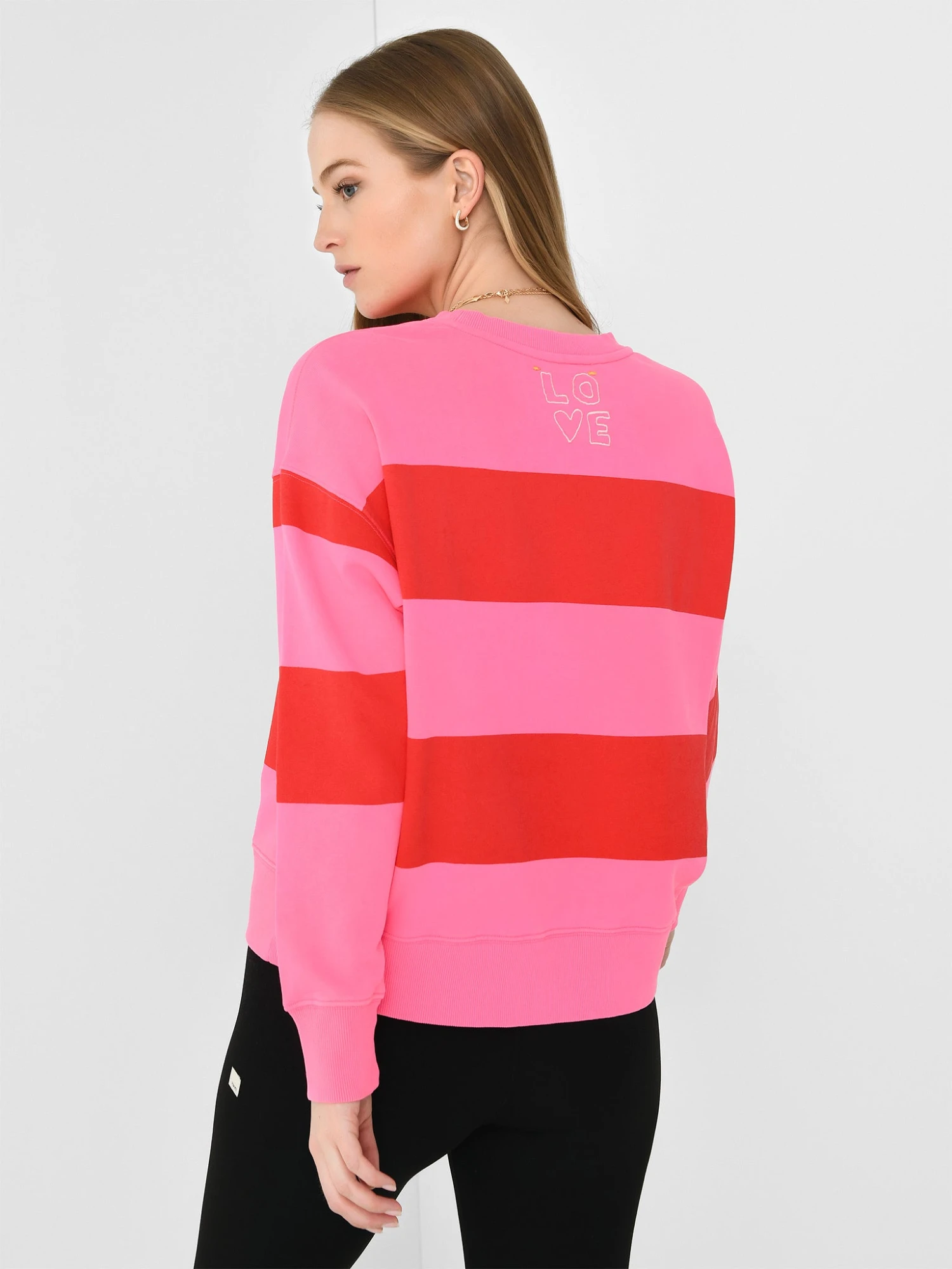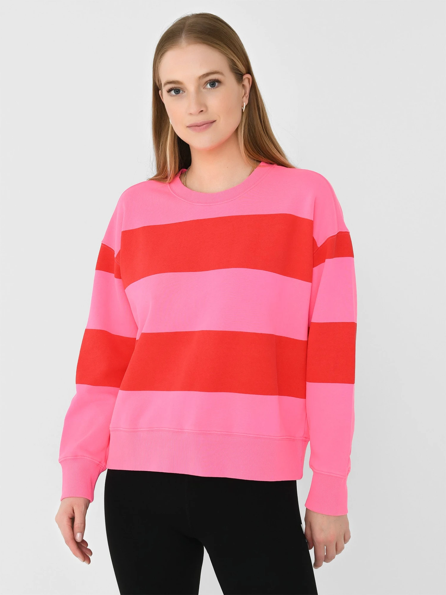 A soft cotton fleece sweatshirt with a wide stripe design.