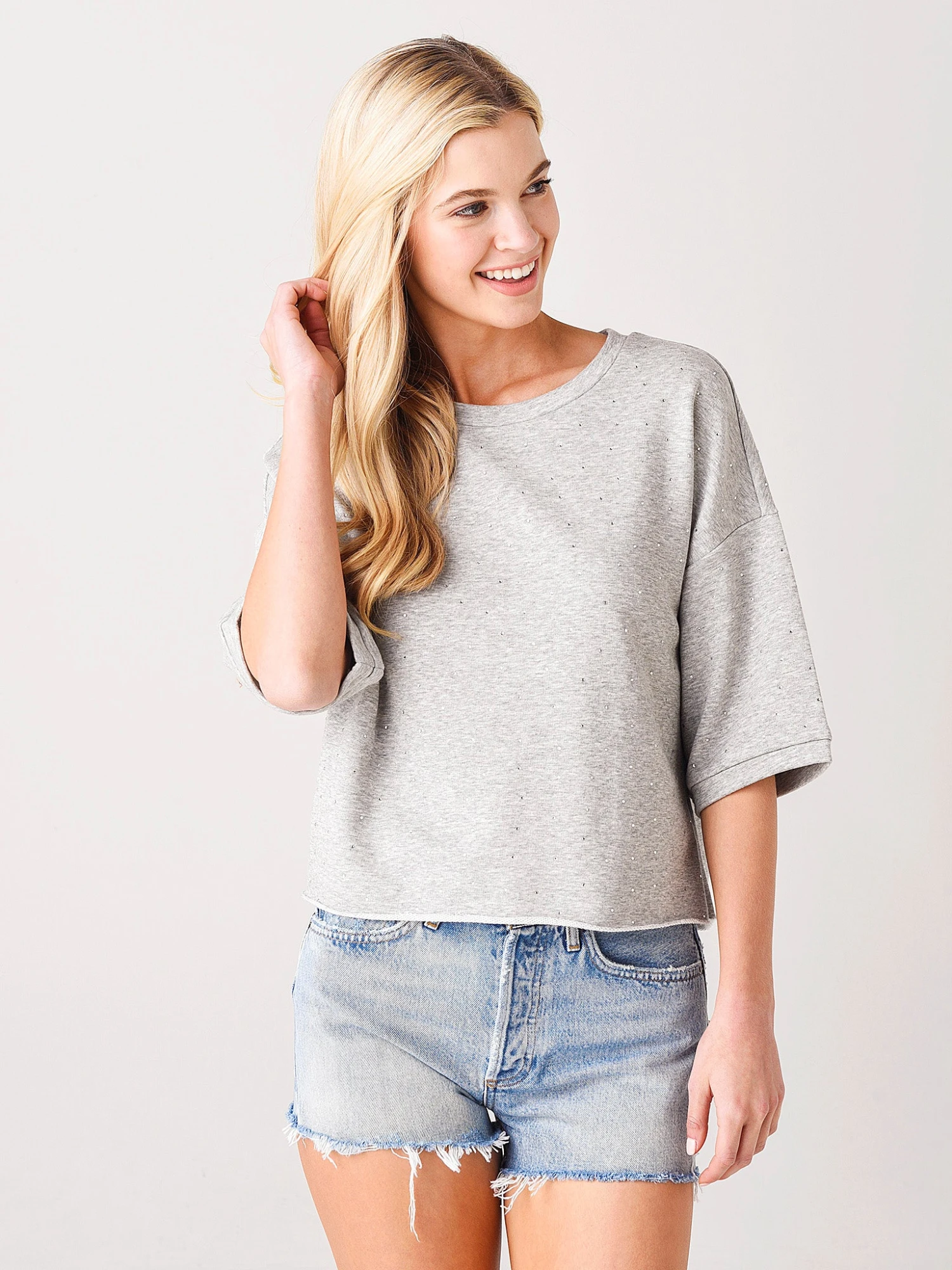 FEATURES:Crew neckElbow length oversized sleeves Relaxed fit Rhinestone embellishments60% Cotton, 40% Polyester Dry clean or hand washModel is wearing size small top and size 24 short.Model’s Measurements: Height: 5’9″; Bust: 32B; Waist: 24″; Hips: 36″; Dress: 4 (US)