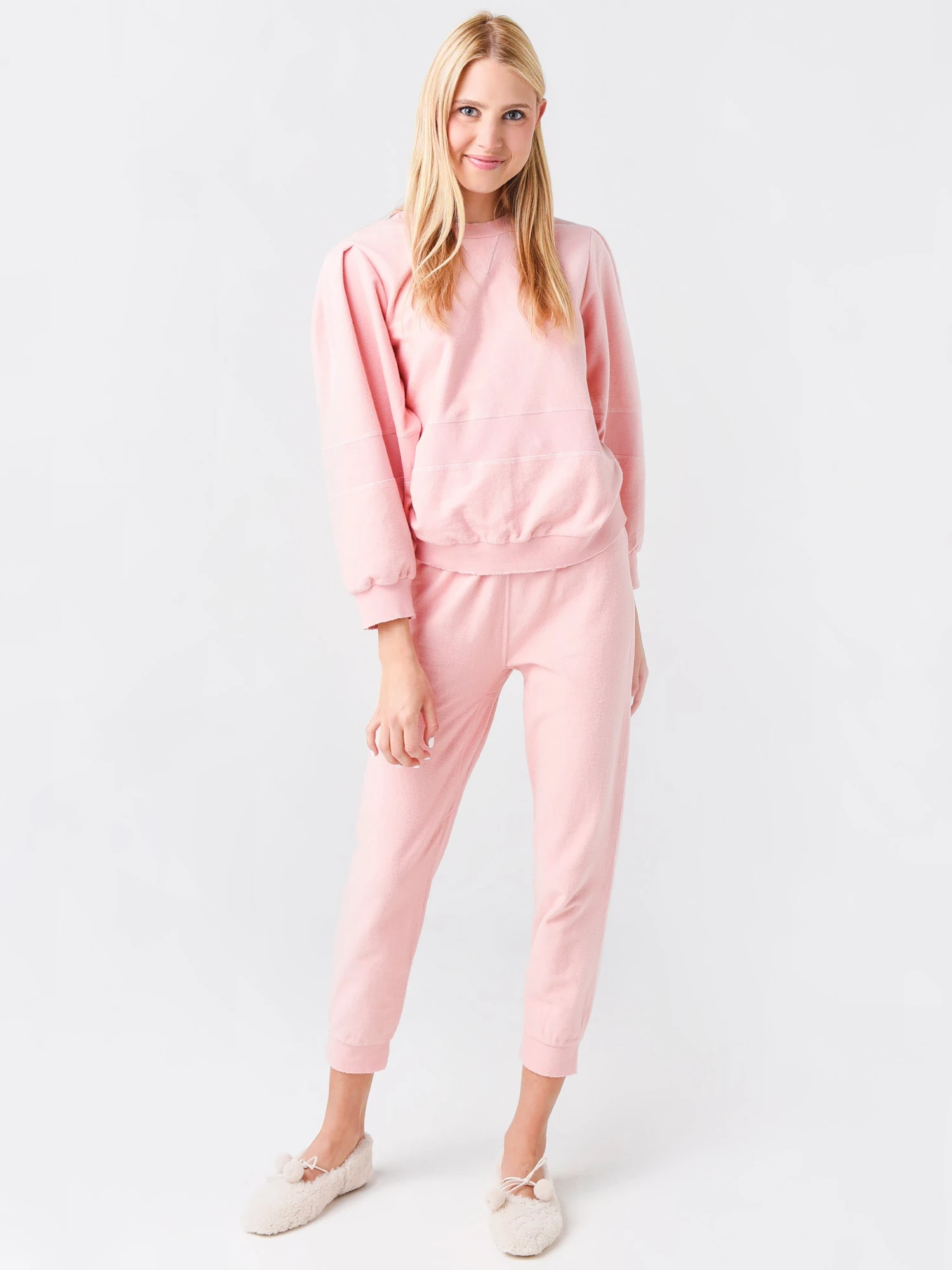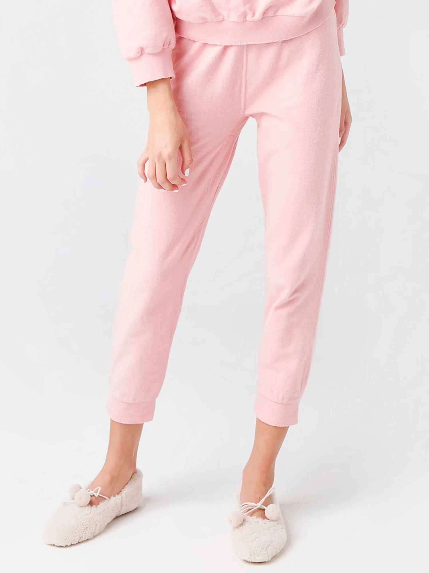 Jogger pant with elasticated waistband with T-Seams and distressed ankle cuffs in a super-soft textured french terry fabrication.