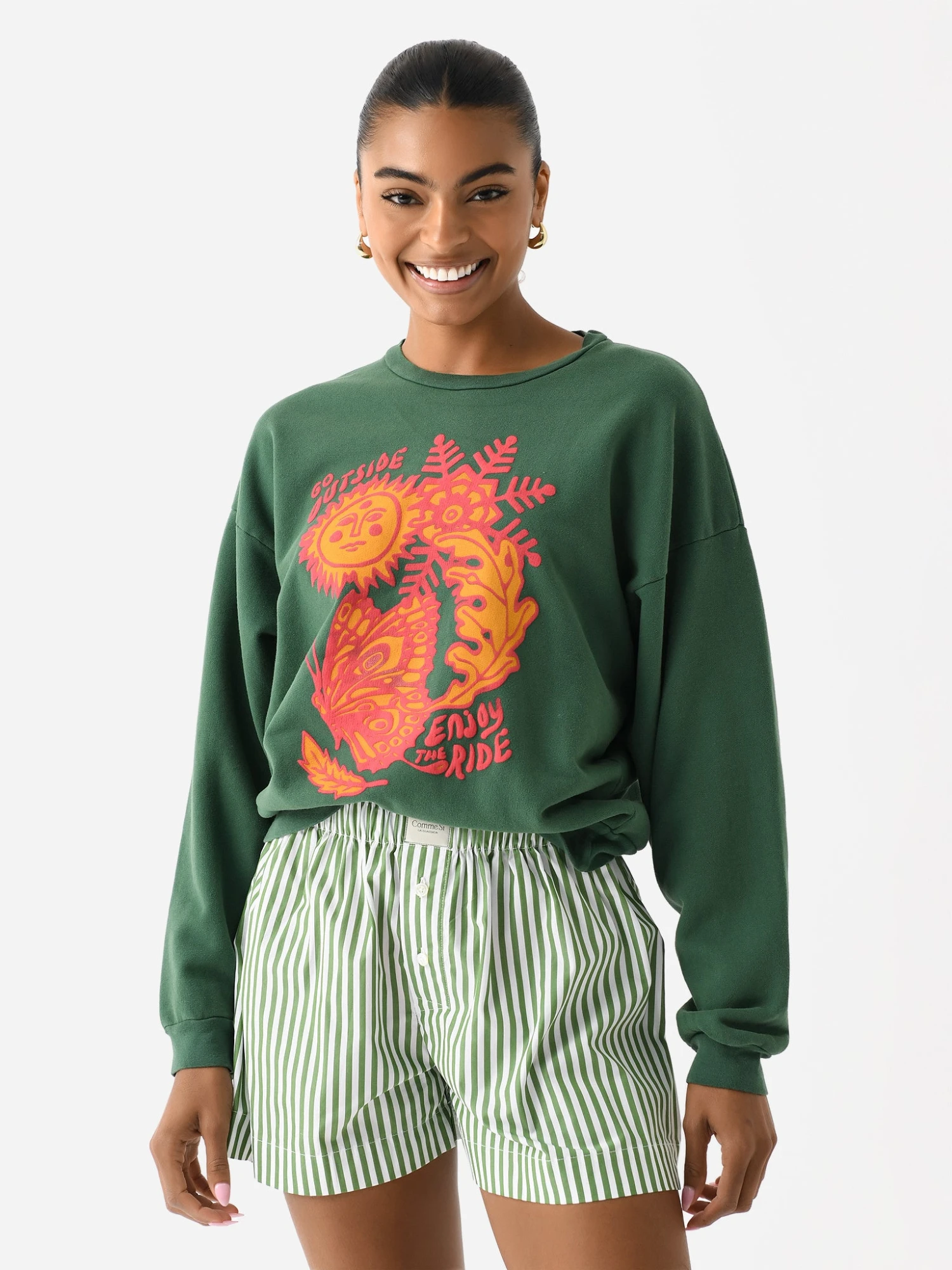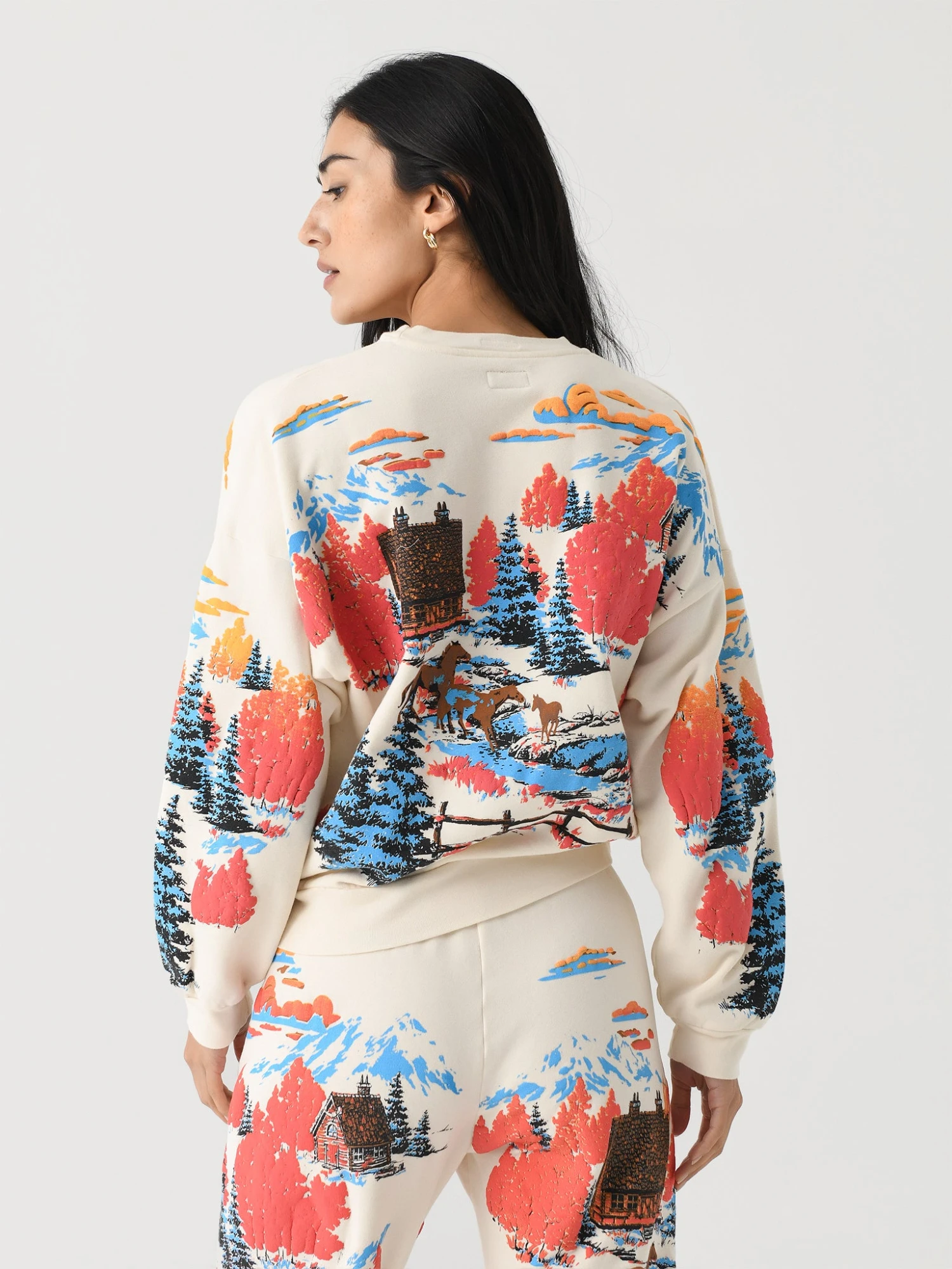 FEATURES:Crew NecklineDropped ShoulderFront GraphicBanded Cuffs and Hem100% CottonRelaxed FitModel is wearing size Small sweatshirt.Cabin Fever: Model’s Measurements: Height: 5’8″ | Bust: 32B | Waist: 25″ | Hips: 36.5″ | Dress Size: 2 (US)Go Outside: Model’s Measurements: Height: 5’8″ | Bust: 32B | Waist: 25.5″ | Hips: 37″ | Dress Size: 2-4 (US)