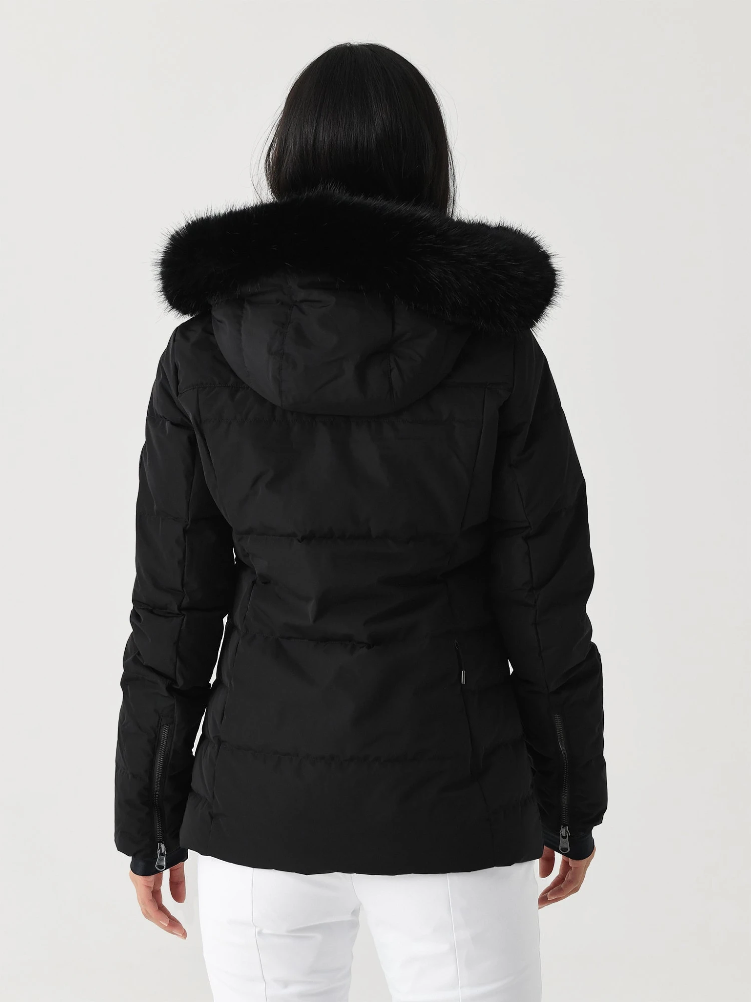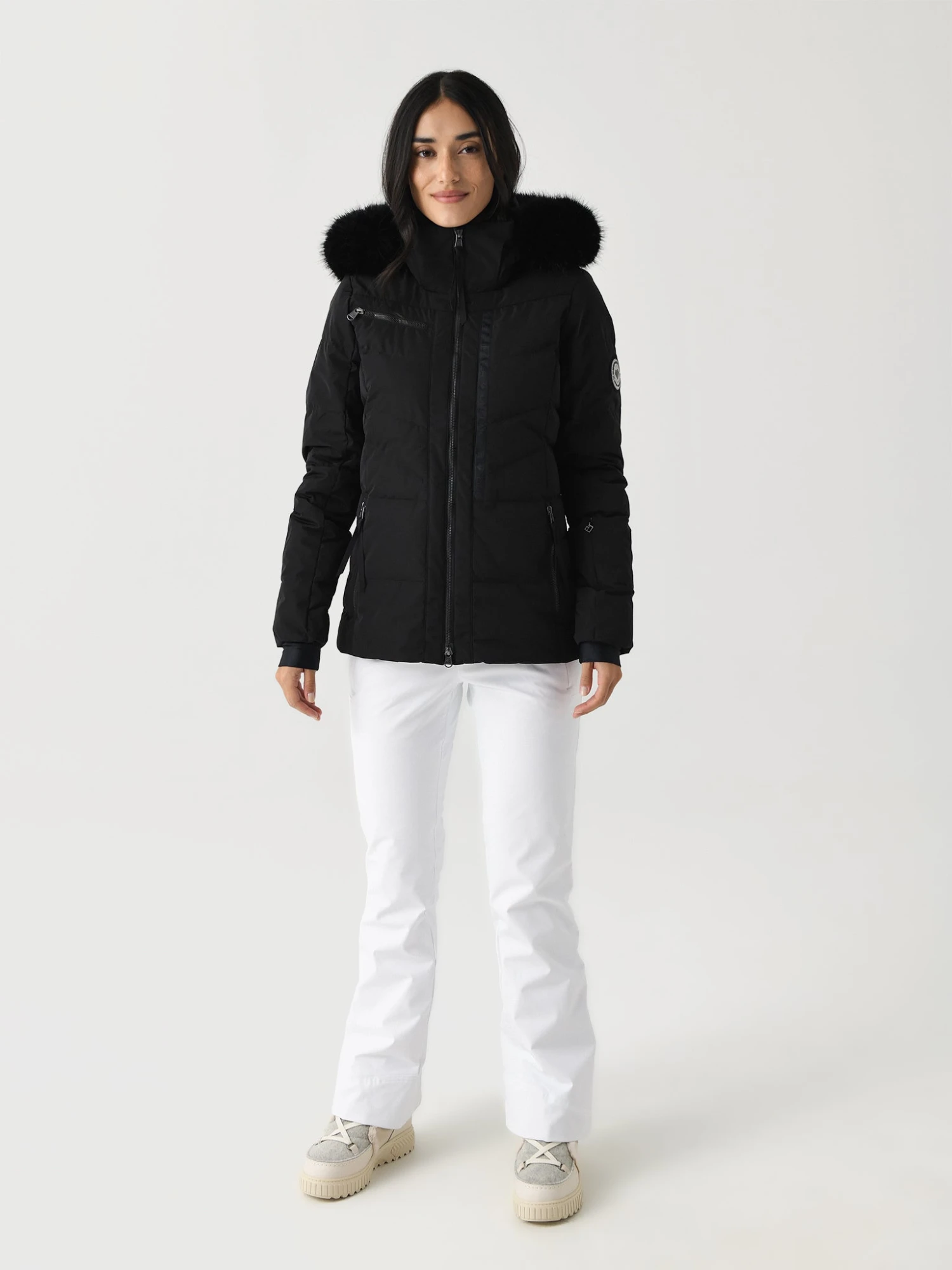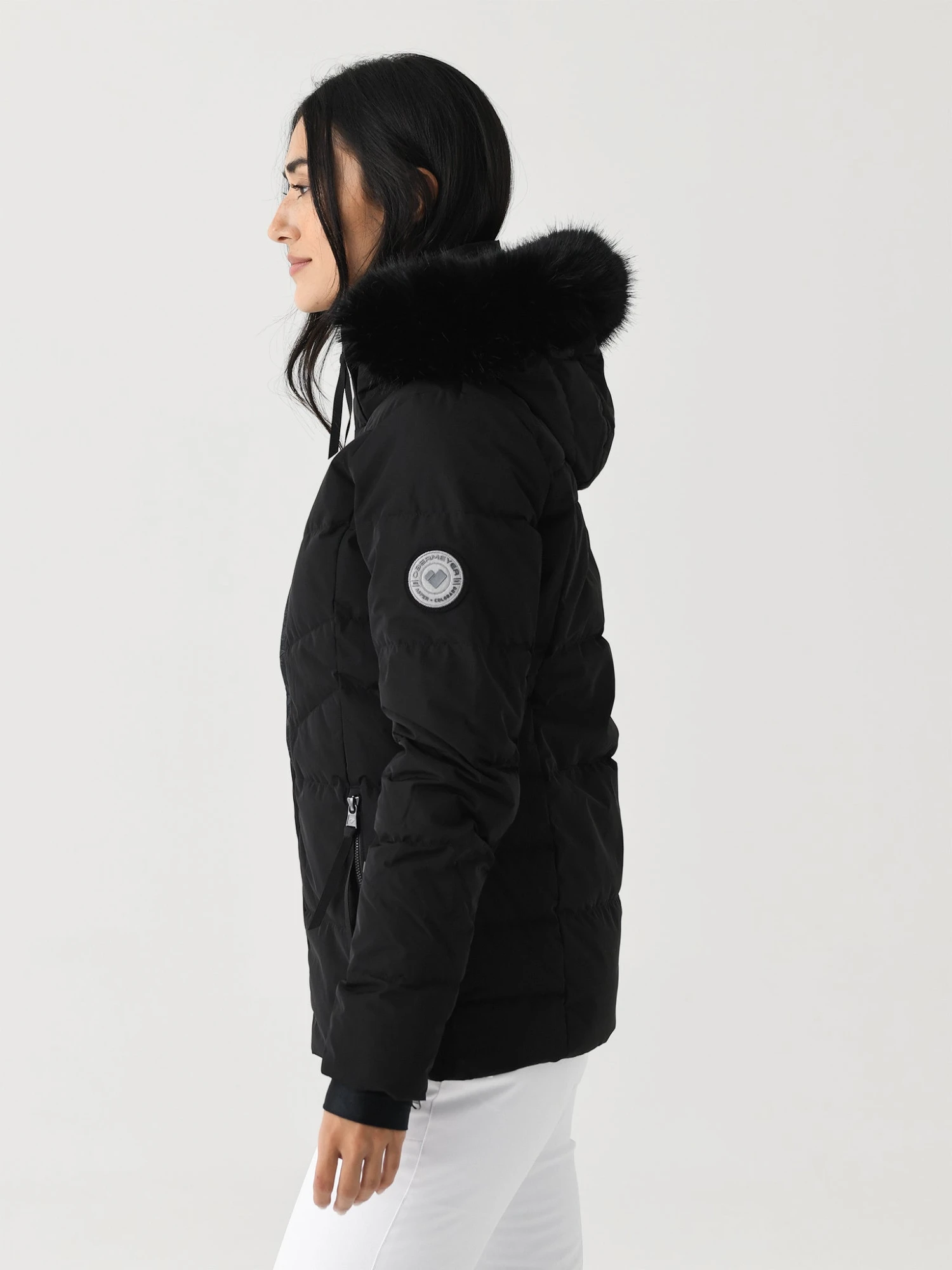 FEATURES:2-Way Adjustable/Removable HoodRemovable Faux FurZipper Cuffs, Stretch Inner Cuffs2-Way Front ZipperYKK® Metaluxe® ZippersPockets: Zipper Chest Pockets, Zipper Pass Pocket, Lumbar Pocket, Interior Electronics Pockets, Zippered Handwarmer PocketsWater-Resistant Powderskirt, Powderskirt with Stretch PanelInterior Windguard, Interior Fleece Lining PanelsAdjustable HemInsulation: Feather & Down 600 Fill Power Duck DownShell: HydroBlock® Sport 100% Polyester Plain WeaveClassic FitModel is wearing size 4 jacket.Black: Model’s Measurements: Height: 5’8″ | Bust: 32B | Waist: 25″ | Hips: 36.5″ | Dress Size: 2 (US)