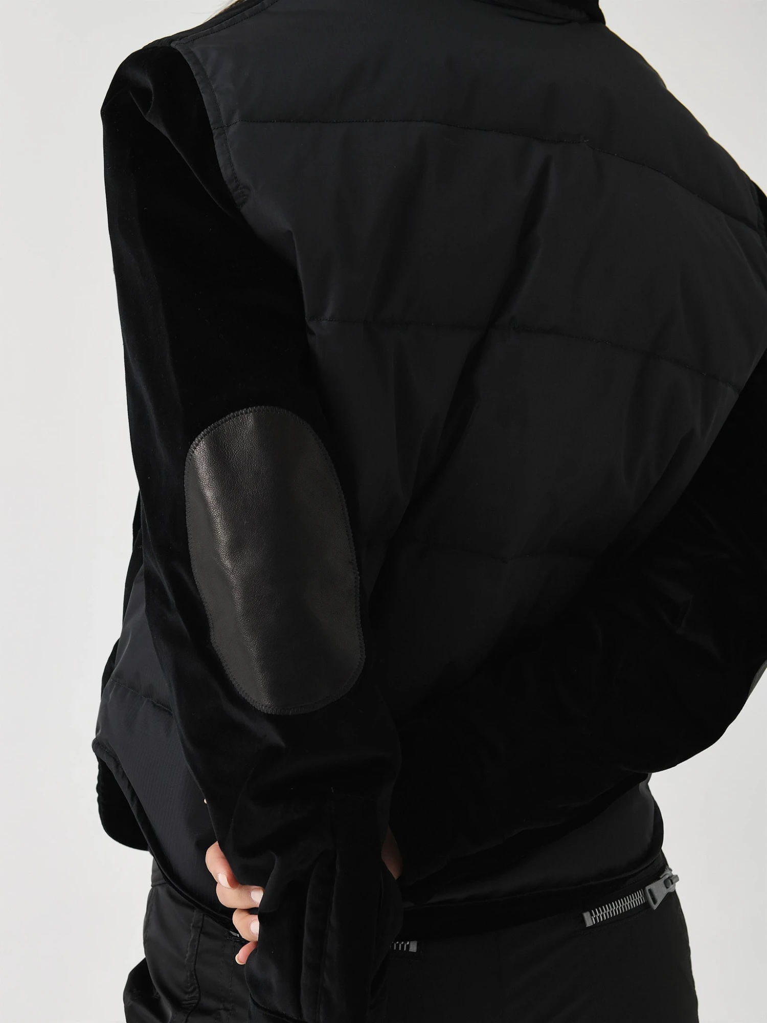 A casual, quilted shirt jacket made from soft velvet with a contrast back panel and warm, down insulation.