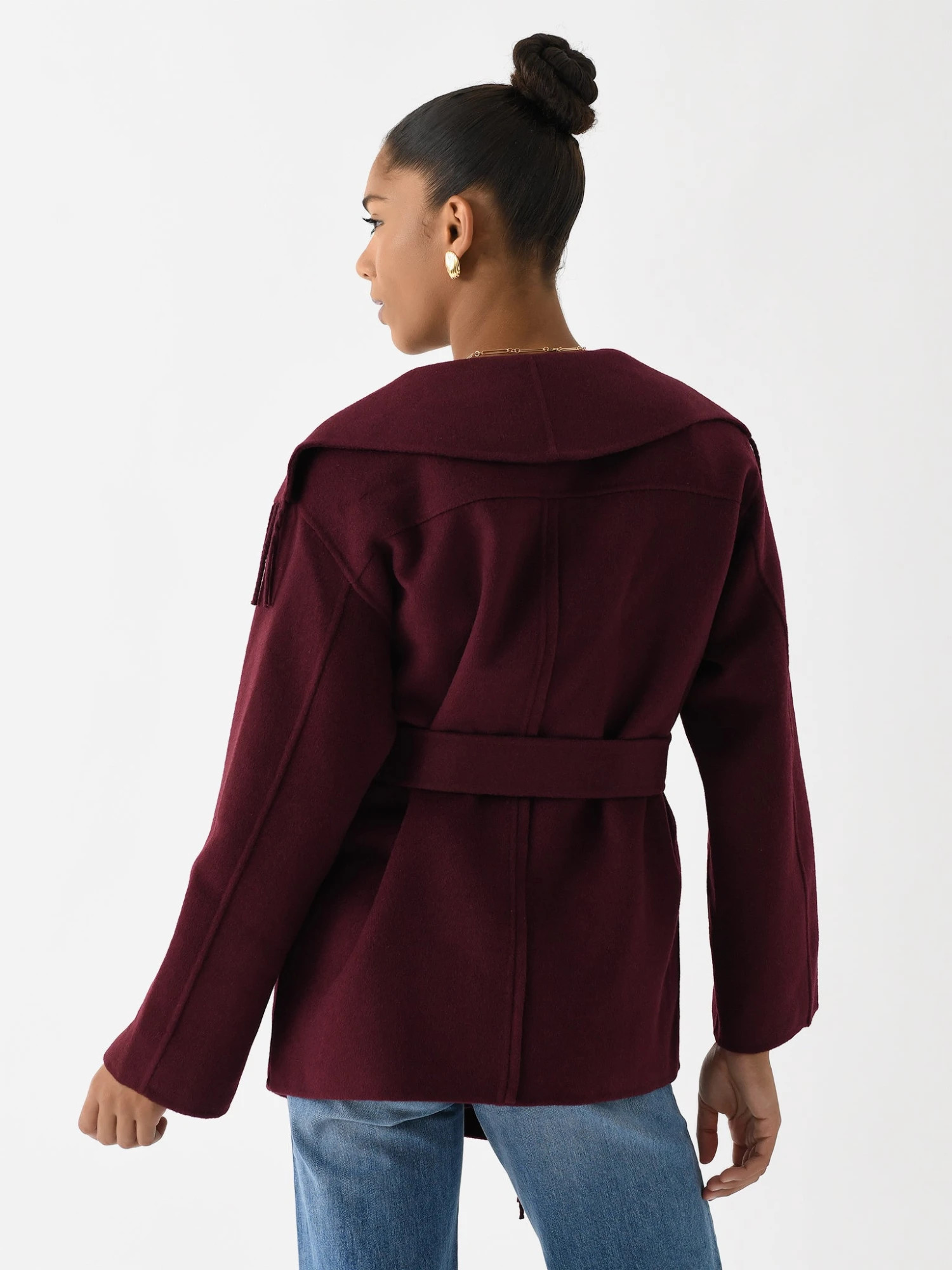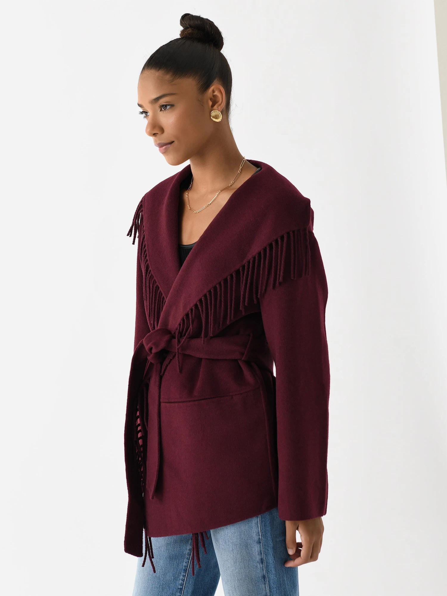 A relaxed jacket made from a wool and polyester blend and finished with a self-tie belt and fringe-trimmed edges.