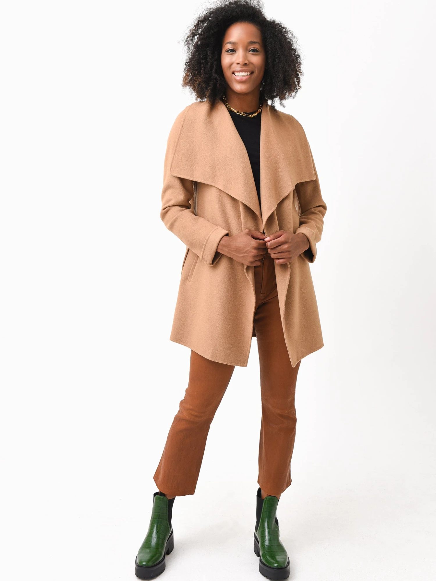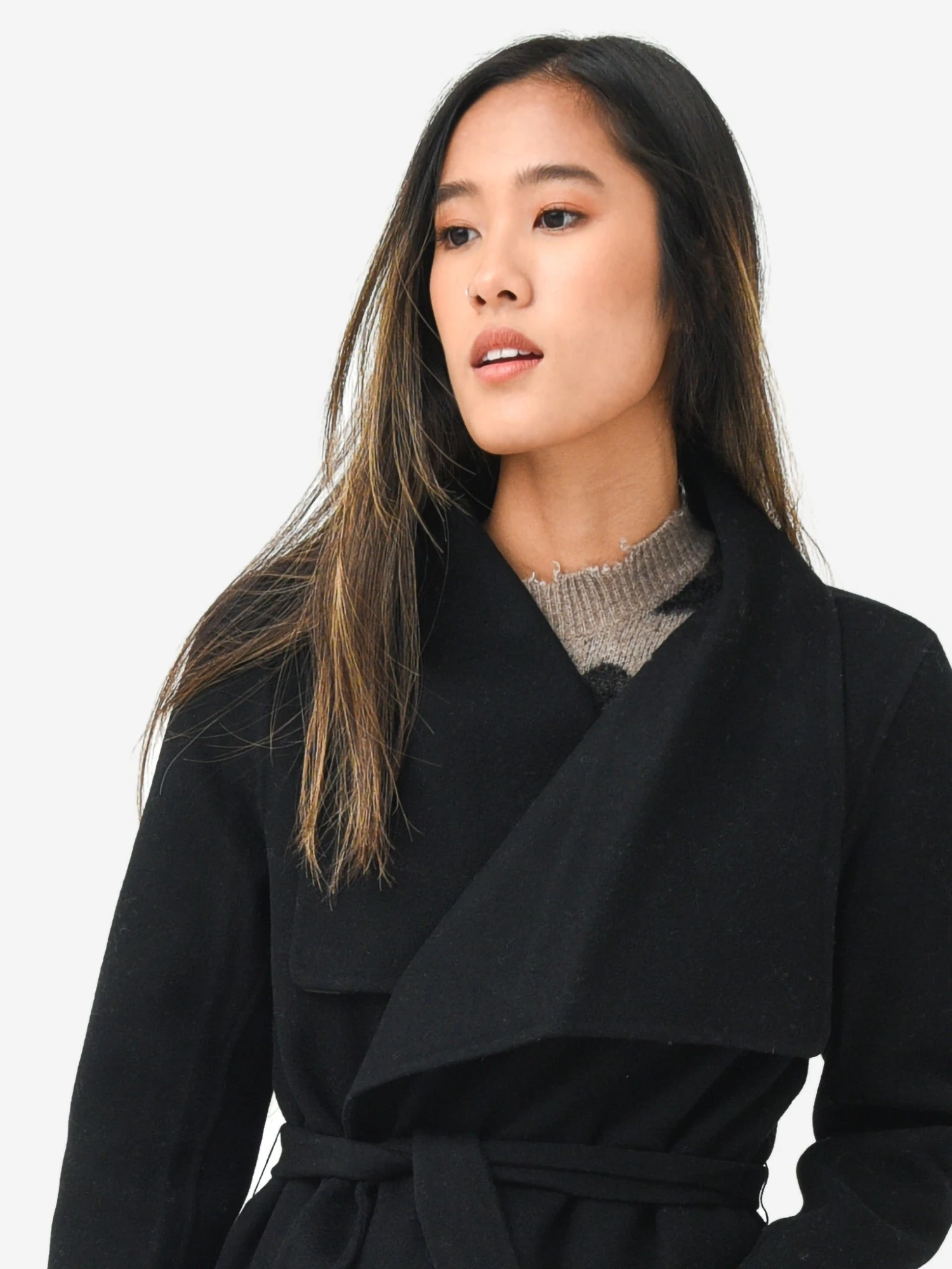 FEATURES:JacketCascade Neckline with Button ClosureLong Sleeve with Turned CuffsAdjustable BeltAngled Welt PocketsMid-Thigh LengthHand-Finished SeamsStraight SilhouetteWoven Fabrication70% Wool, 30% PolyamideRelaxed FitModel is wearing size Small jacket.Toffee: Model’s Measurements: Height: 5’10” | Bust: 34B | Waist: 25.5″ | Hips: 36.5″ | Dress Size: 2 (US)Black: Model’s Measurements: Height: 5’7″ | Bust: 32B | Waist: 25″ | Hips: 35″ | Dress Size: 0-2 (US)