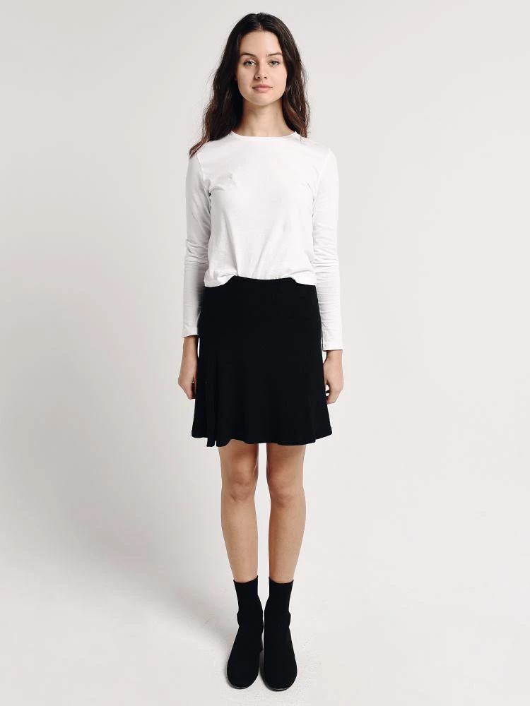 FEATURES:High-rise Elastic waist A-line 49% polyester, 46% rayon, 5% spandex Made in the USAStyled with J Brand tee Style # JB000917 and Vince booties Style # G0103F2001. Model is wearing size small skirt and tee.