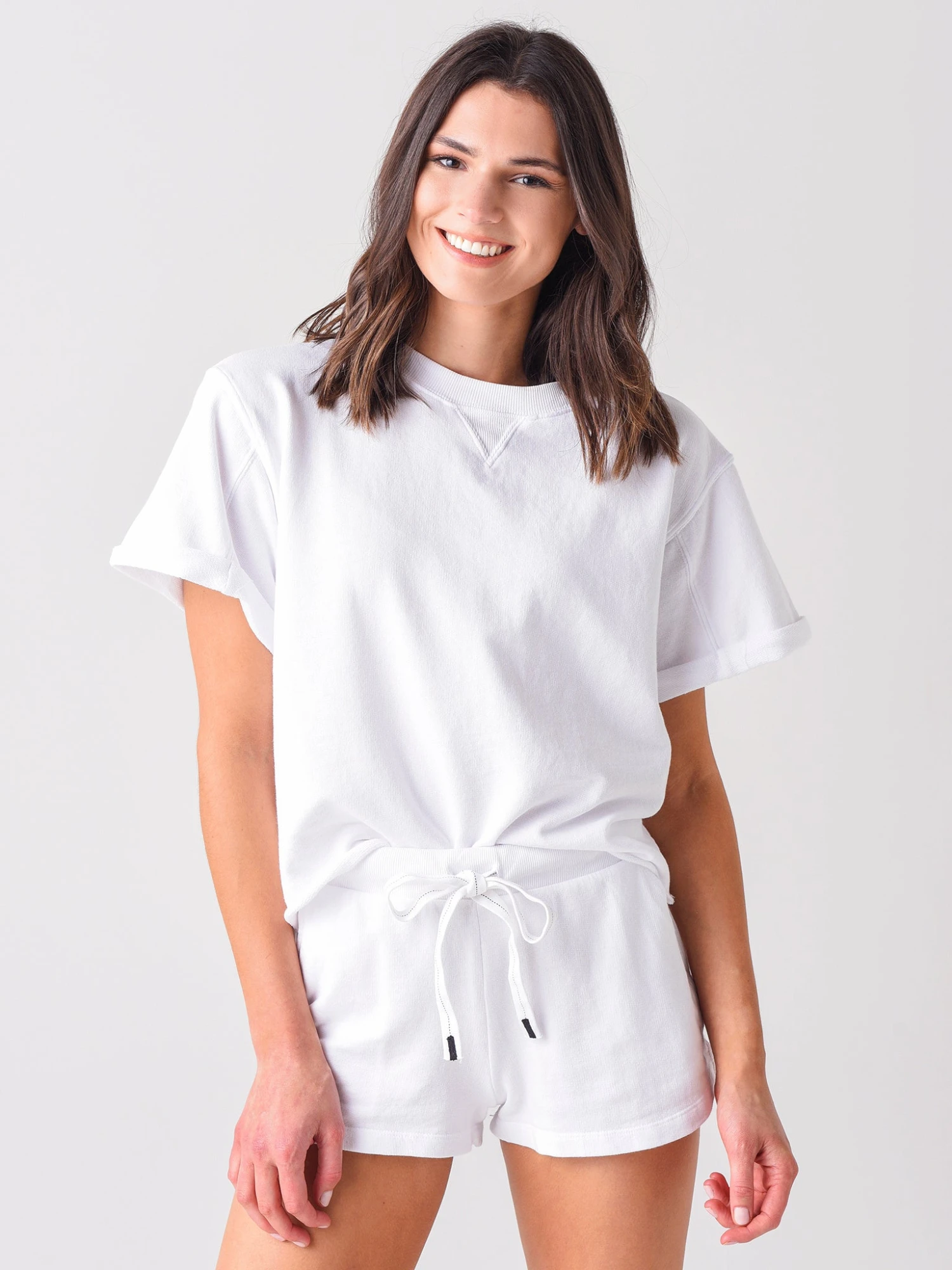 FEATURES:SweatshirtCrew NecklineV-Stitch at NecklineWide Short Sleeve with Roll CuffBaby French Terry FabricationSuper SoftRelaxed Fit100% CottonModel is wearing size Small shirt.Model’s Measurements: Height: 5’9.5″; Bust: 34A; Waist: 26.5″; Hips: 37″; Dress Size: 2-4 (US)