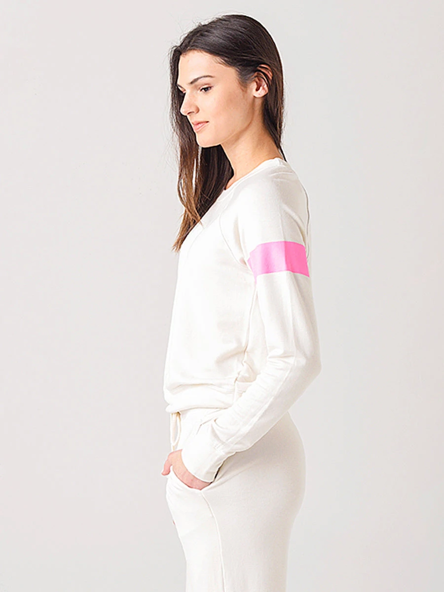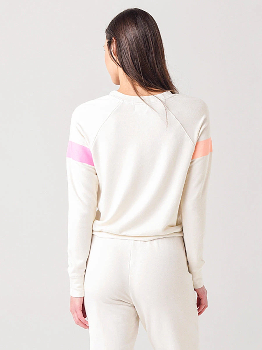 FEATURES:Crew neckLong sleeveRaglan sleeveStriped details on sleeve 82% Modal, 13% Cotton 5% SpandexMade in the USAModel is wearing size 1 sweatshirt and sweatpantModel’s Measurements: Height: 5’9.5″; Bust: 34A; Waist: 26.5″; Hips: 37″; Dress Size: 2-4 (US)
