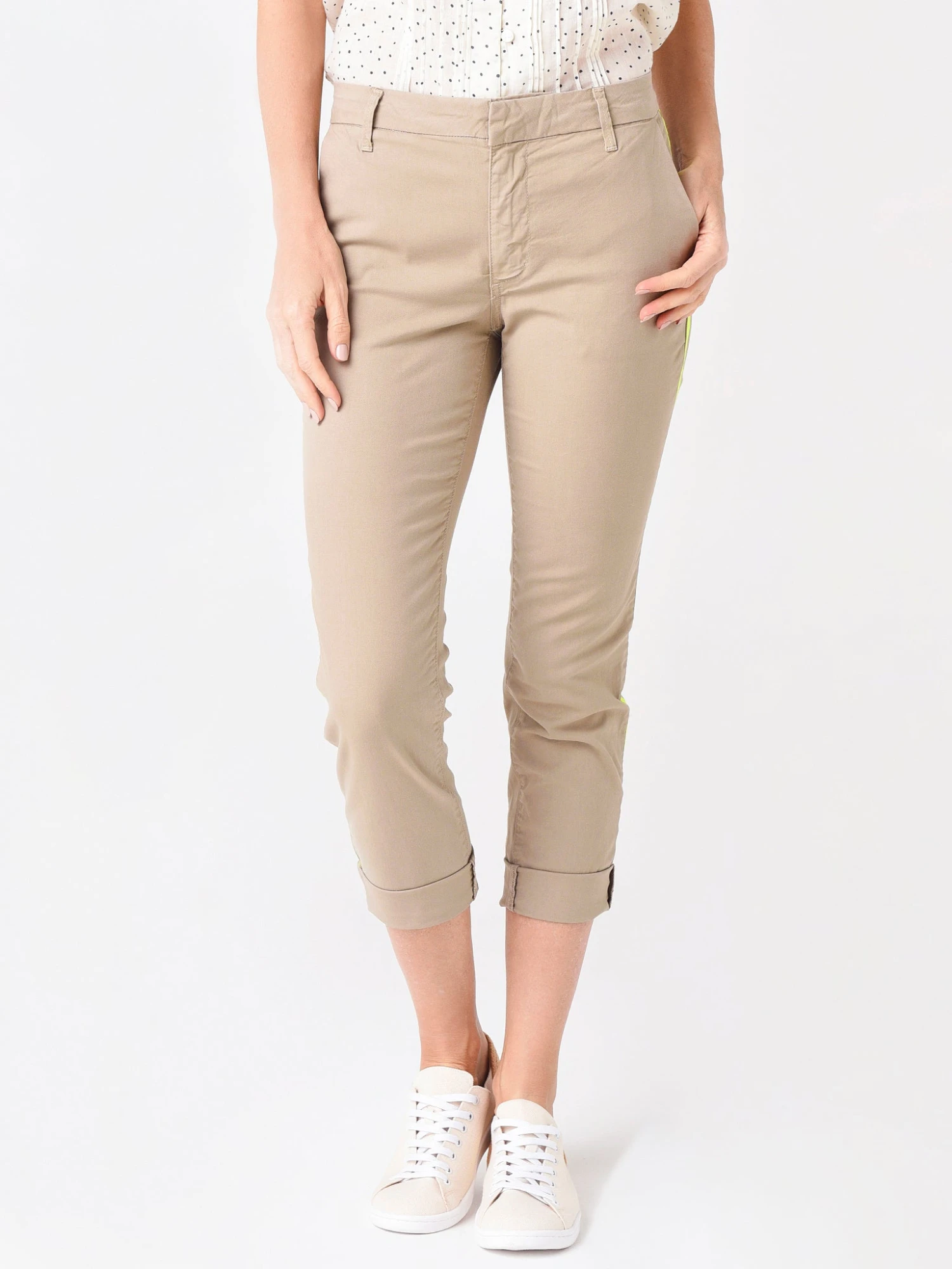 FEATURES:Chino TrouserButton, Zip-Fly ClosureBelt loopsQuarter Top PocketsBack PocketsStripe Trim DetailRoll-Up Ankle CuffsGarment Dyed and Stone WashedClassic FitMade in USA98% Cotton, 2% SpandexModel is wearing size 25 pant.Model’s Measurements: Height: 5’10”; Bust: 34C; Waist: 25.5″; Hips: 36″; Dress Size: 2-4 (US)