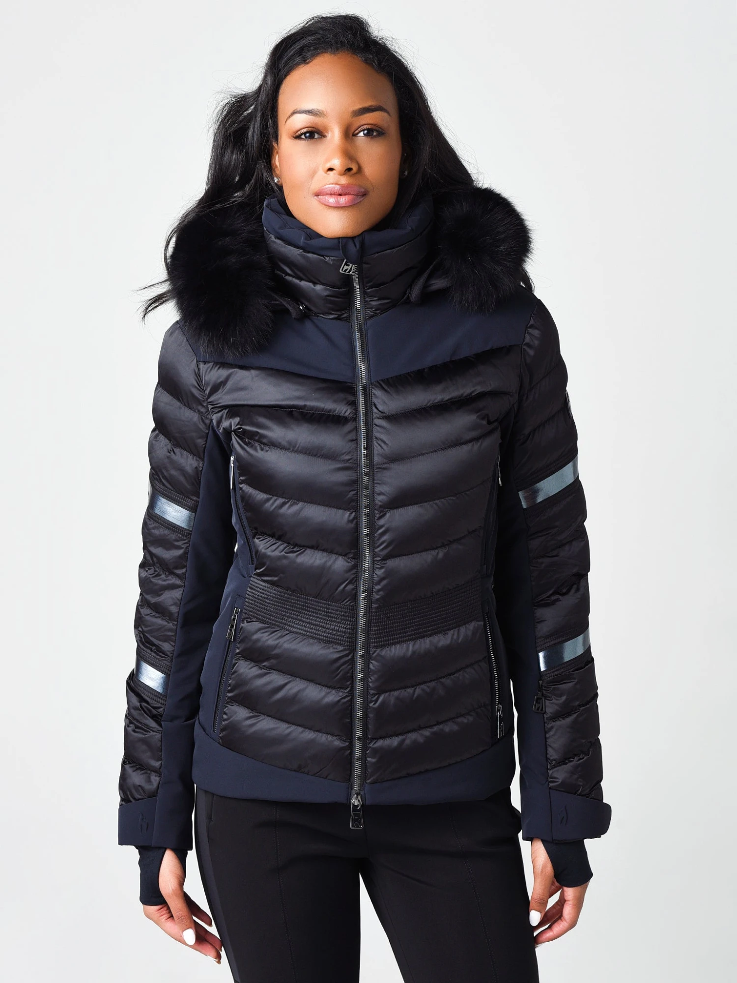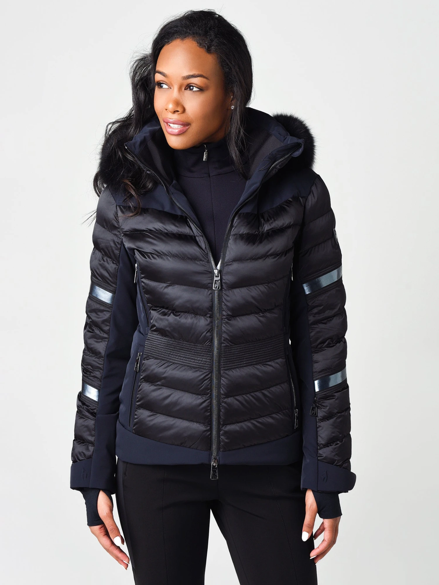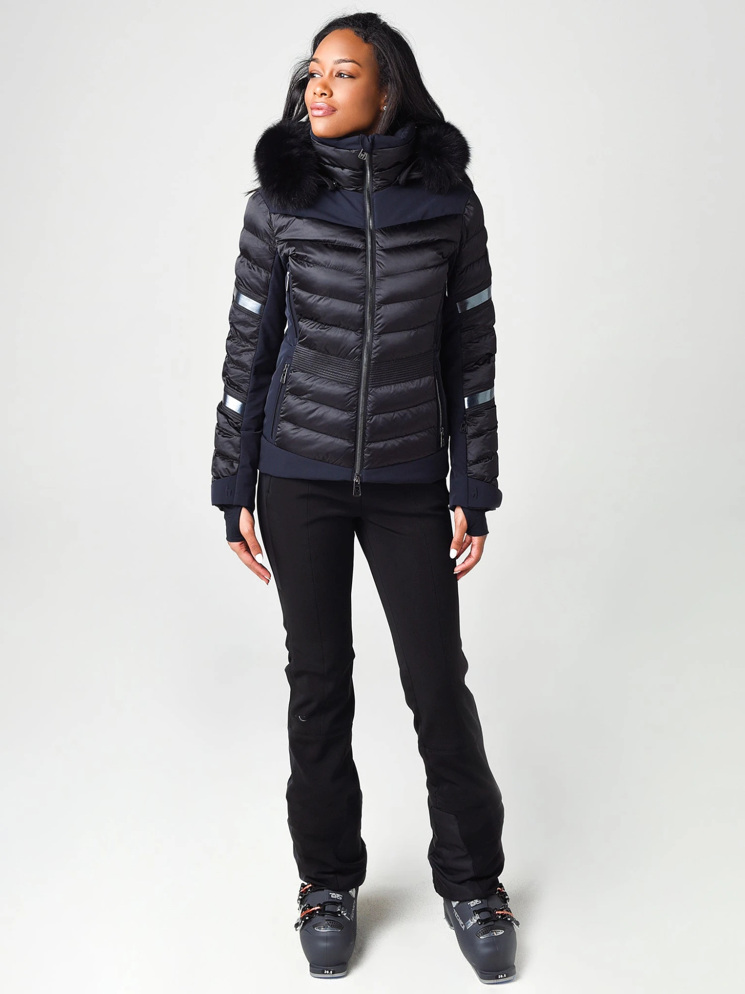 FEATURES:Ski JacketStand-Up Collar with Chin-GuardDetachable Hood, AdjustableDetachable Fur Collar3D Laser Logo2-Way YKK Vislon Zipper Closure2 Chest Zipper Pockets, 2 Zippered Hand Pockets, Ski Pass Pocket, Interior Pockets and Media PortElasticized Cuffs with ThumbholesElastic SnowgaiterSynthetic Thermolite InsulationWaterproof Rating 20,000 mm / Breathability Rating 20,000 g/m2/24hRipstop Nylon FabricationShell 1: 100% Polyamide, Shell 2: 84% Polyamide, 16% Elastane; Lining: 95% Polyester, 5% Elastane; Lining 2: 100% Polyester; Padding: 100% PolyesterModel is wearing size 36 jacket, baselayer and pant. Model’s Measurements: Height: 5’8″; Bust: 34B; Waist: 24.5″; Hips: 35″; Dress Size: 2 (US)