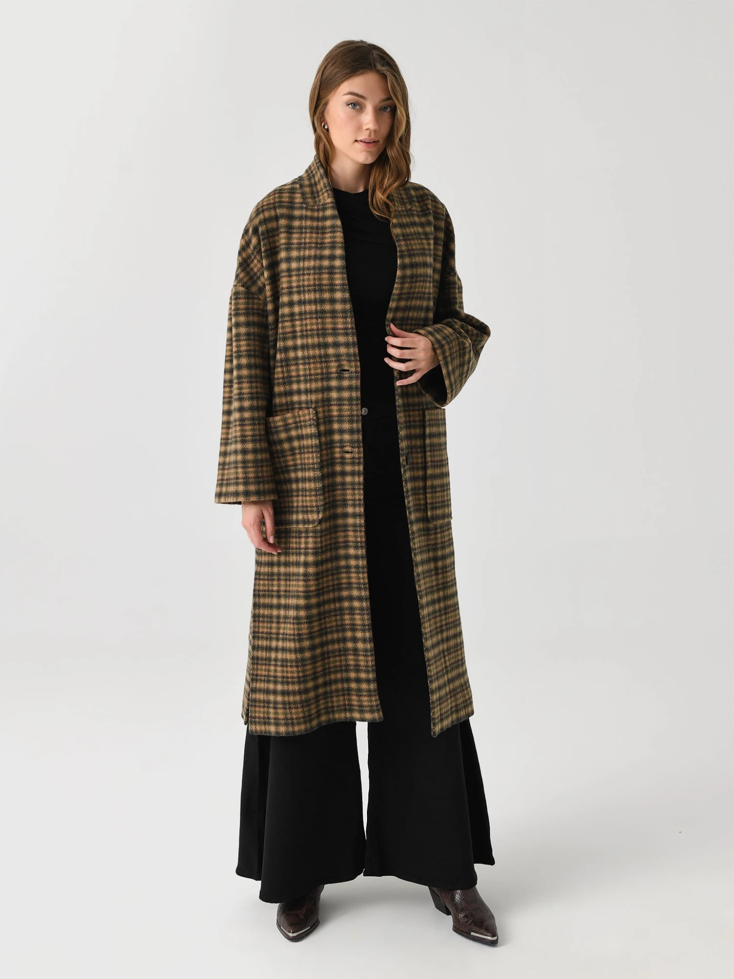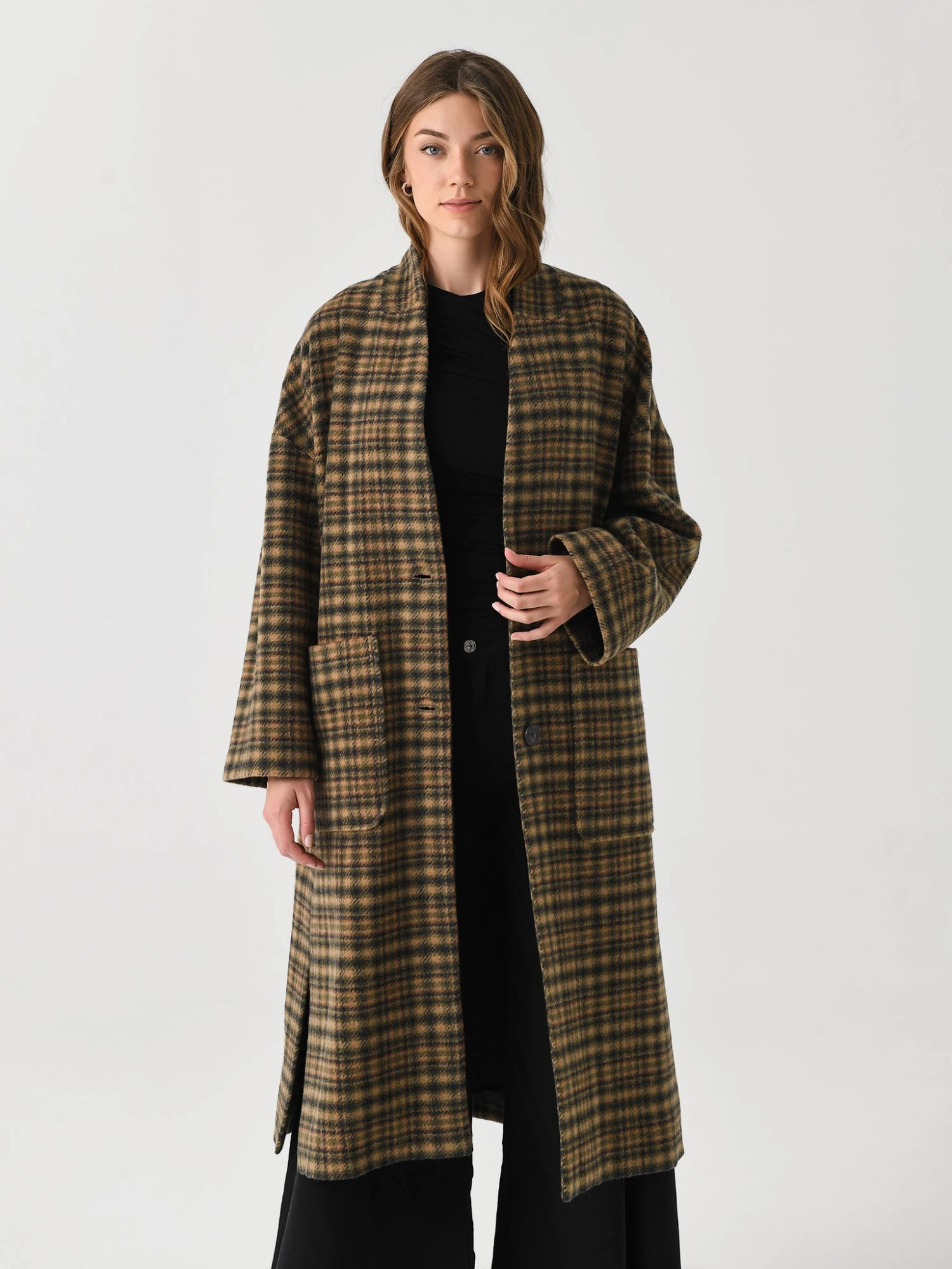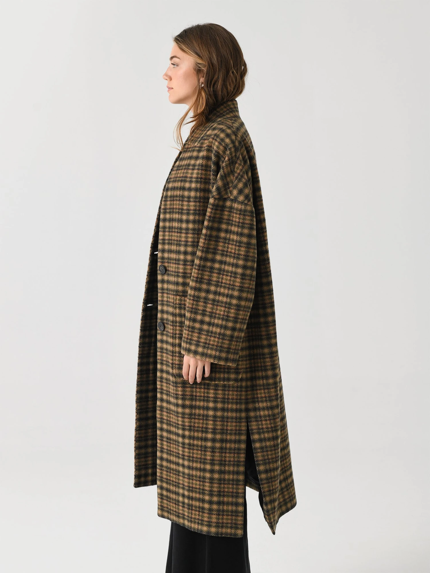 An extra long, oversized coat made from a soft wool blend and finished with patch pockets and horn-style buttons.