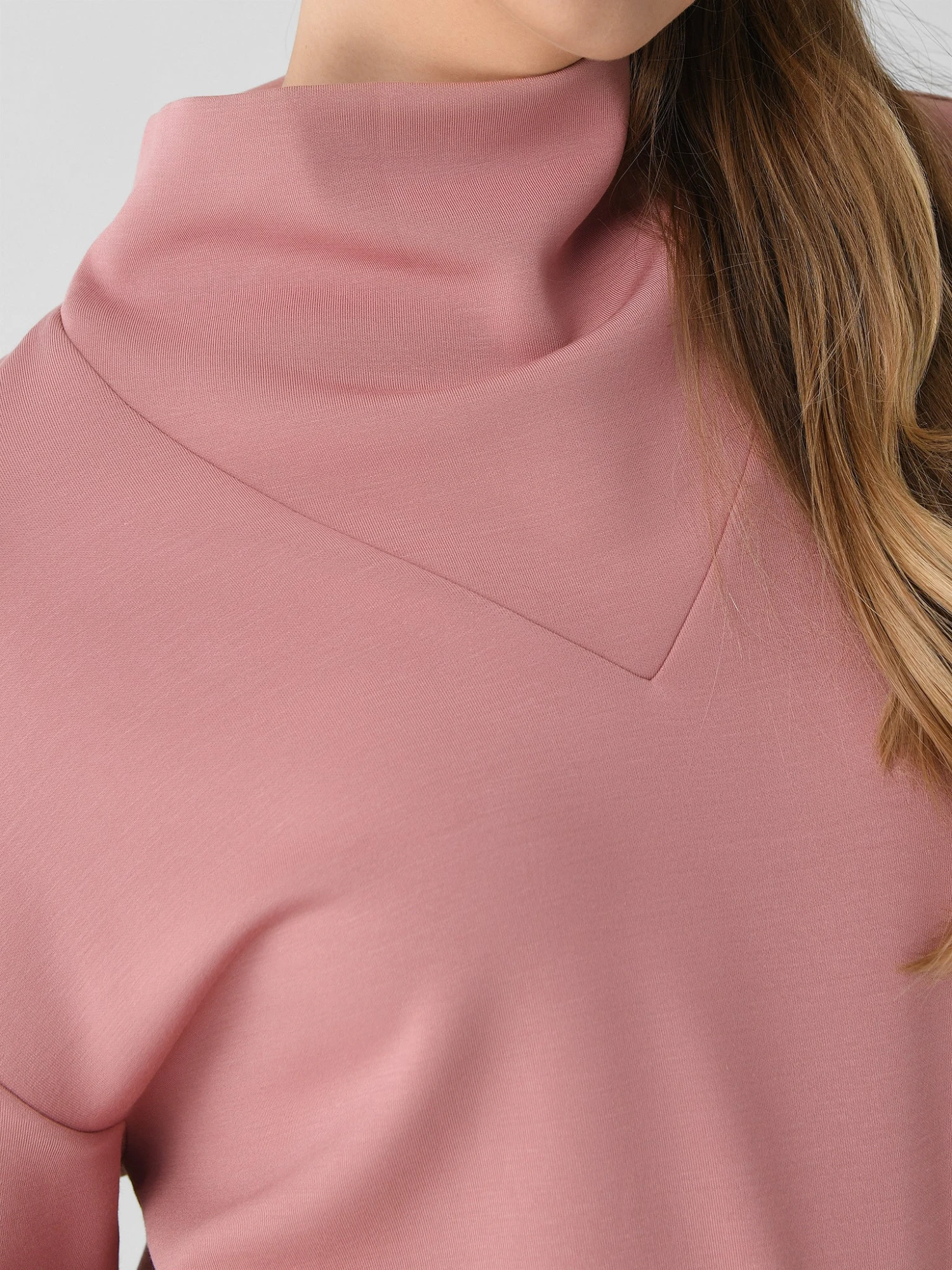 A cowl-neck sweatshirt with a v-panel detail and adjustable drawcord hem for a customized fit.
