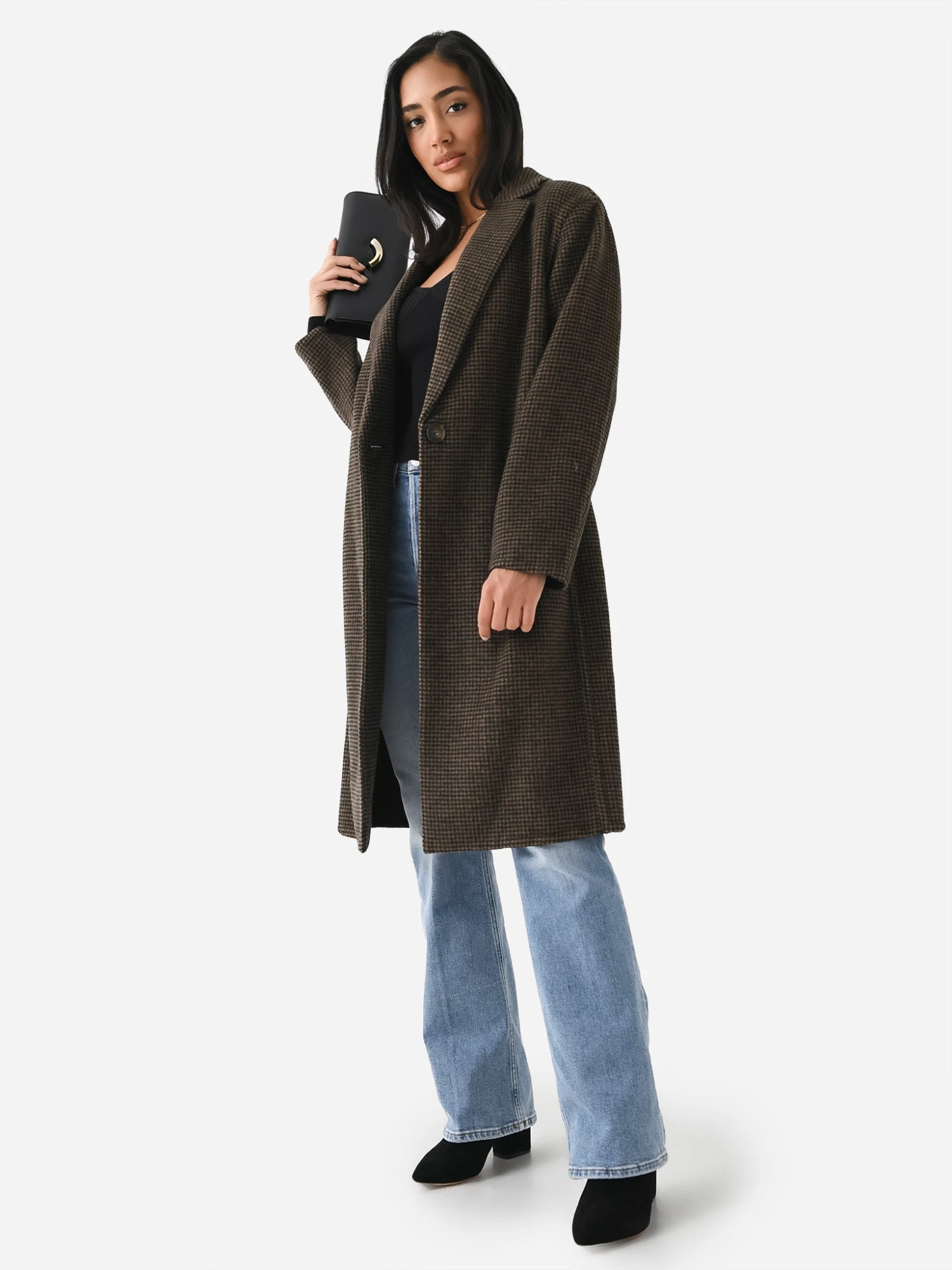 Houndstooth-printed long coat constructed from an Italian brushed recycled wool blend.