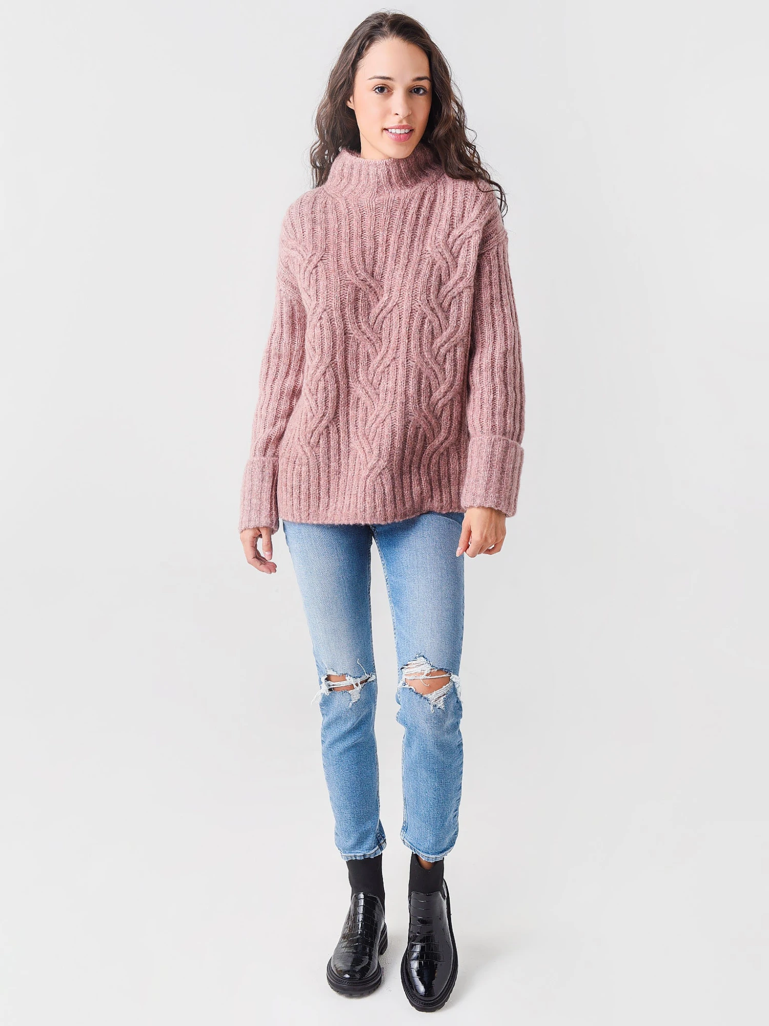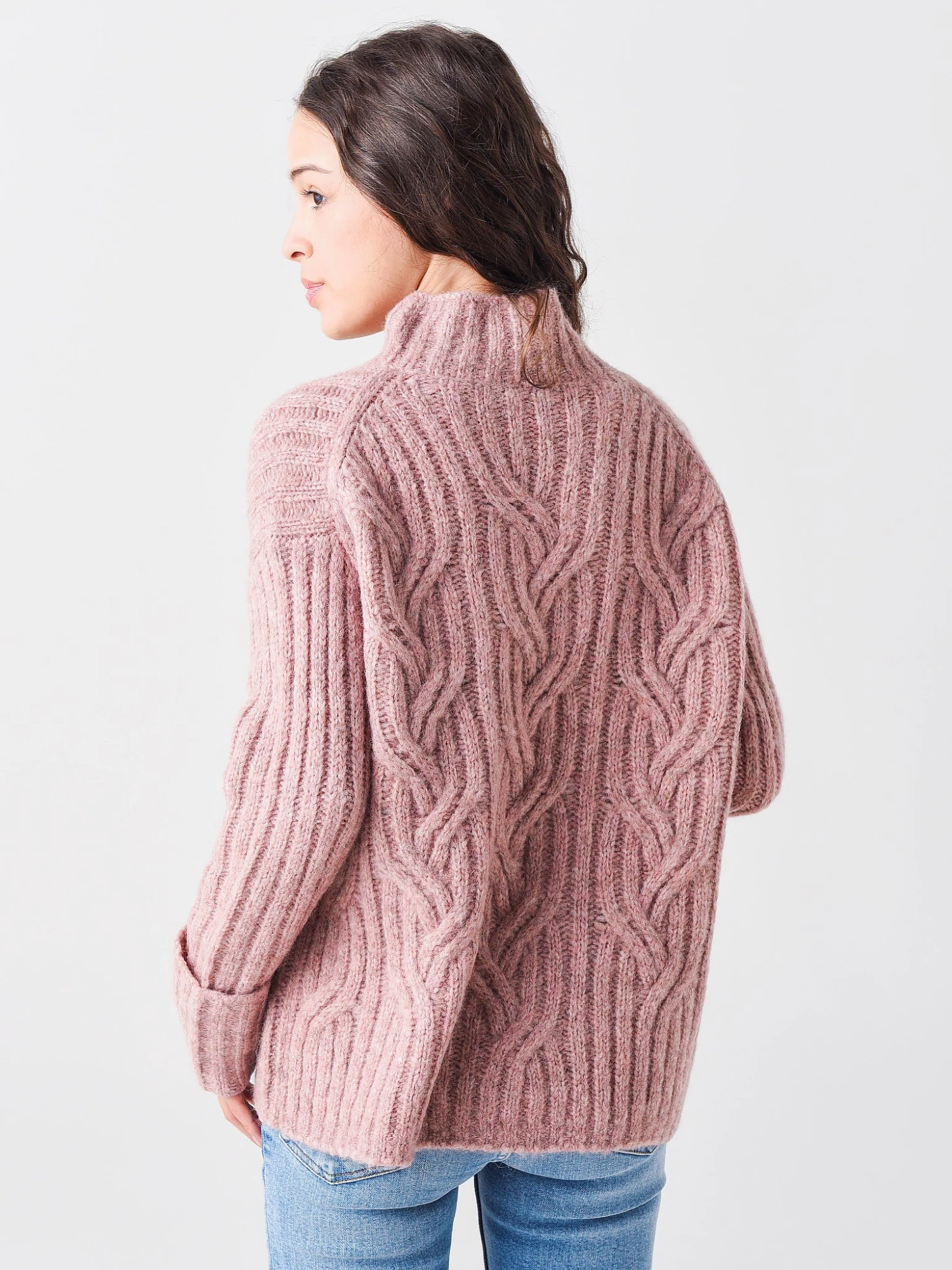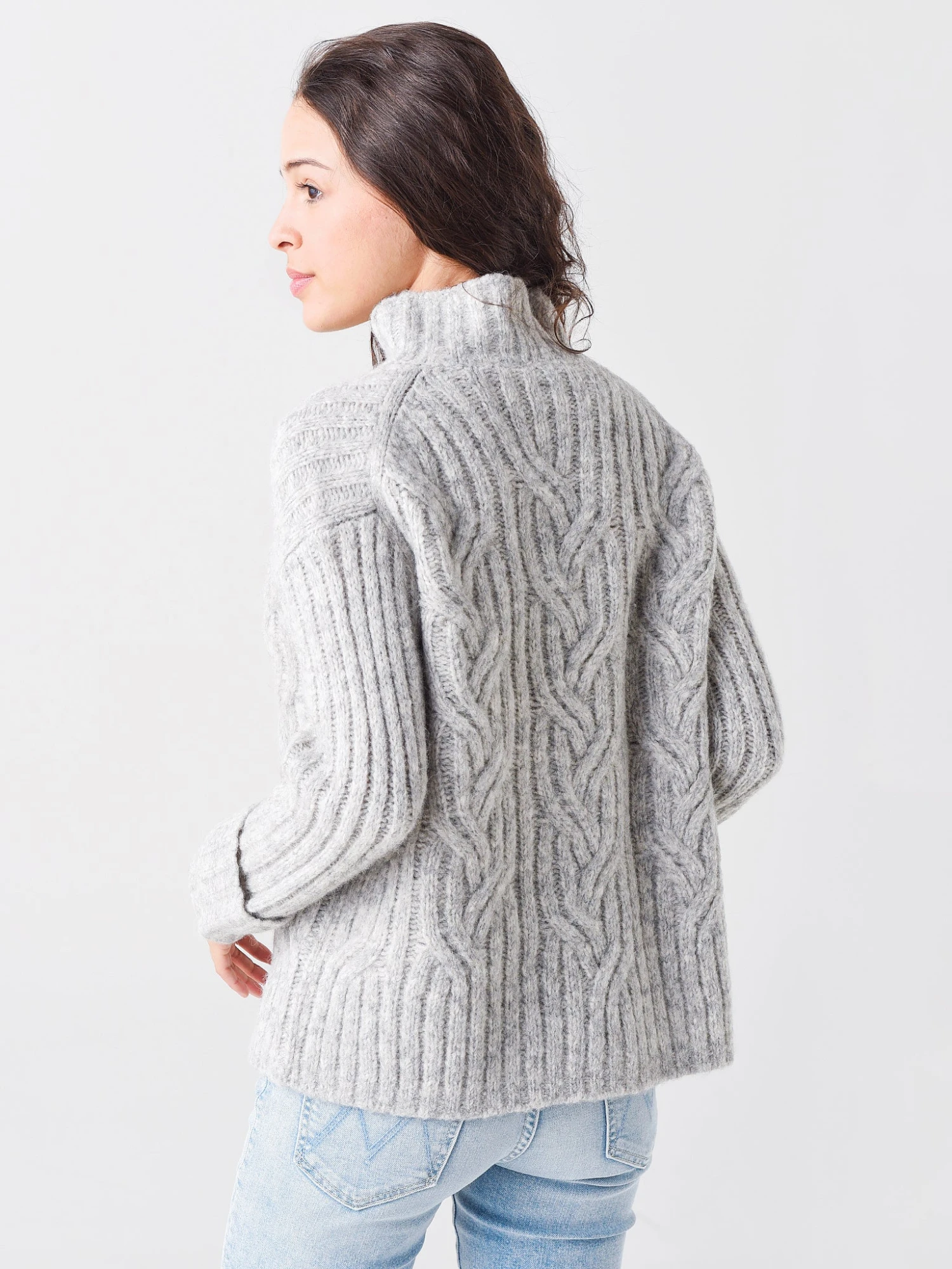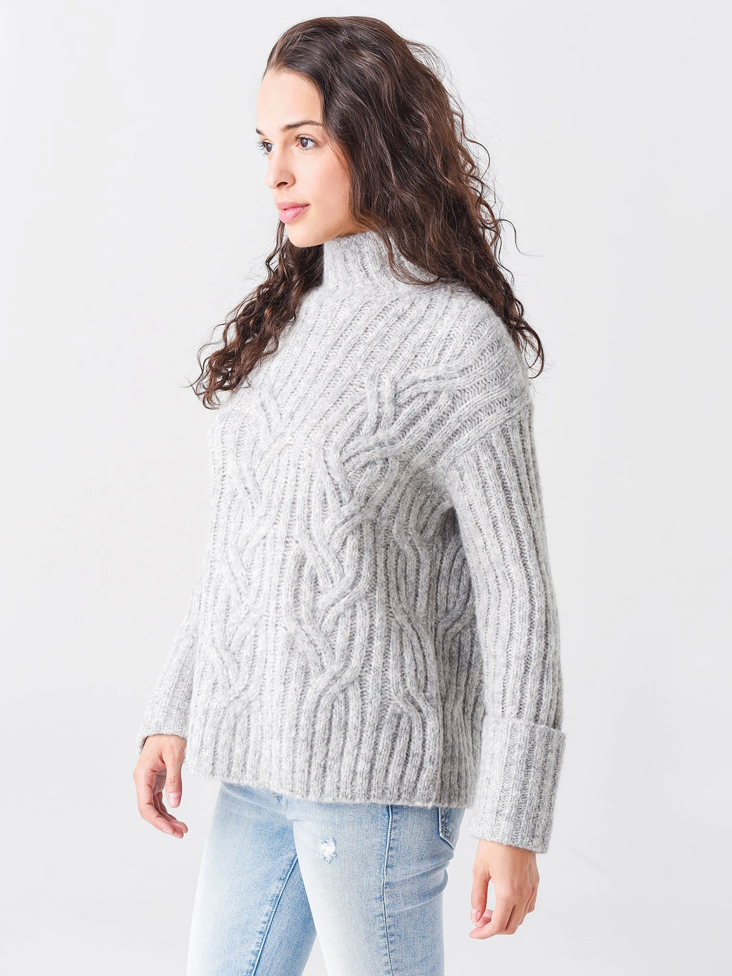FEATURES:SweaterTurtleneckCable Knit FabricationDrop ShoulderLong SleeveCuffsRib-Knit TextureThermal InsulationRelaxed FitStraight HemSelf: 74% Alpaca, 13% WoolTrim: 72% Alpaca, 16% Polyamide, 11% Wool, 1% SpandexModel is wearing size Small sweater.Model’s Measurements: Height: 5’8″ | Bust: 32C | Waist: 23″ | Hips: 35″ | Dress Size: 0-2 (US)