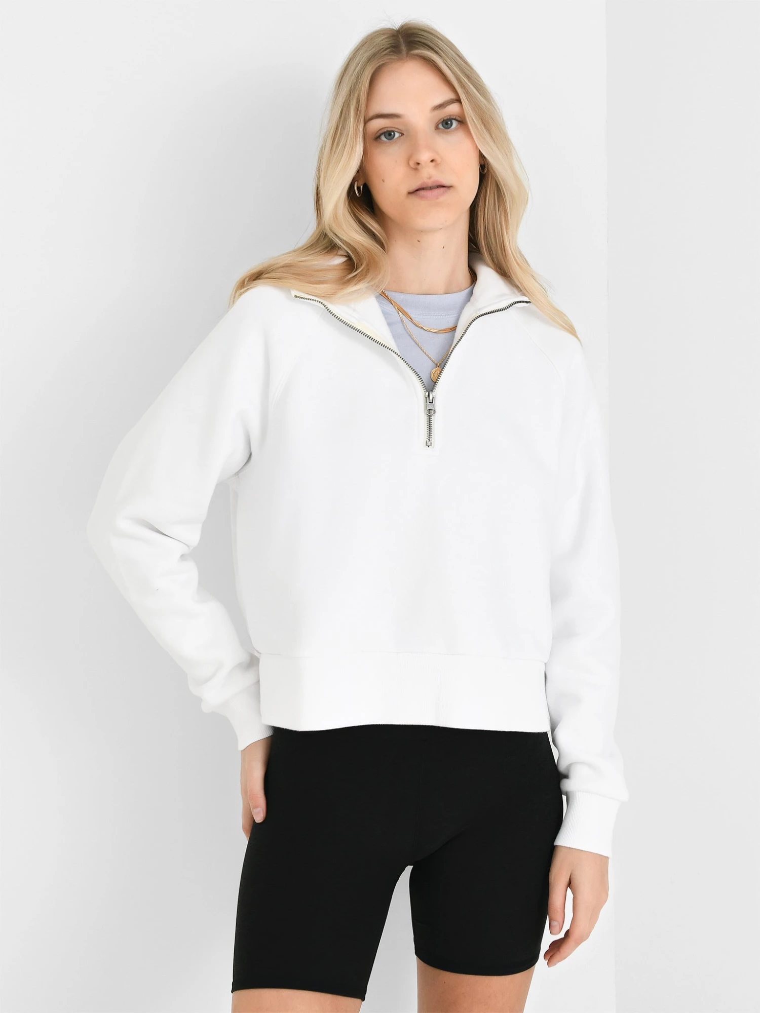 FEATURES:High NecklineHalf-Zip ClosureRaglan SleevesBanded Cuffs and HemFleece Fabrication66% Organic Cotton, 34% PolyesterClassic FitModel is wearing size Small hoodie.Chia, Lavender Mist, Smoke Blue: Model’s Measurements: Height: 5’10.5″ | Bust: 32B | Waist: 25″ | Hips: 36.5″ | Dress Size: 0-2 (US)White: Model’s Measurements: Height: 5’8.5″ | Bust: 32C | Waist: 25″ | Hips: 38.5″ | Dress Size: 4-6 (US)