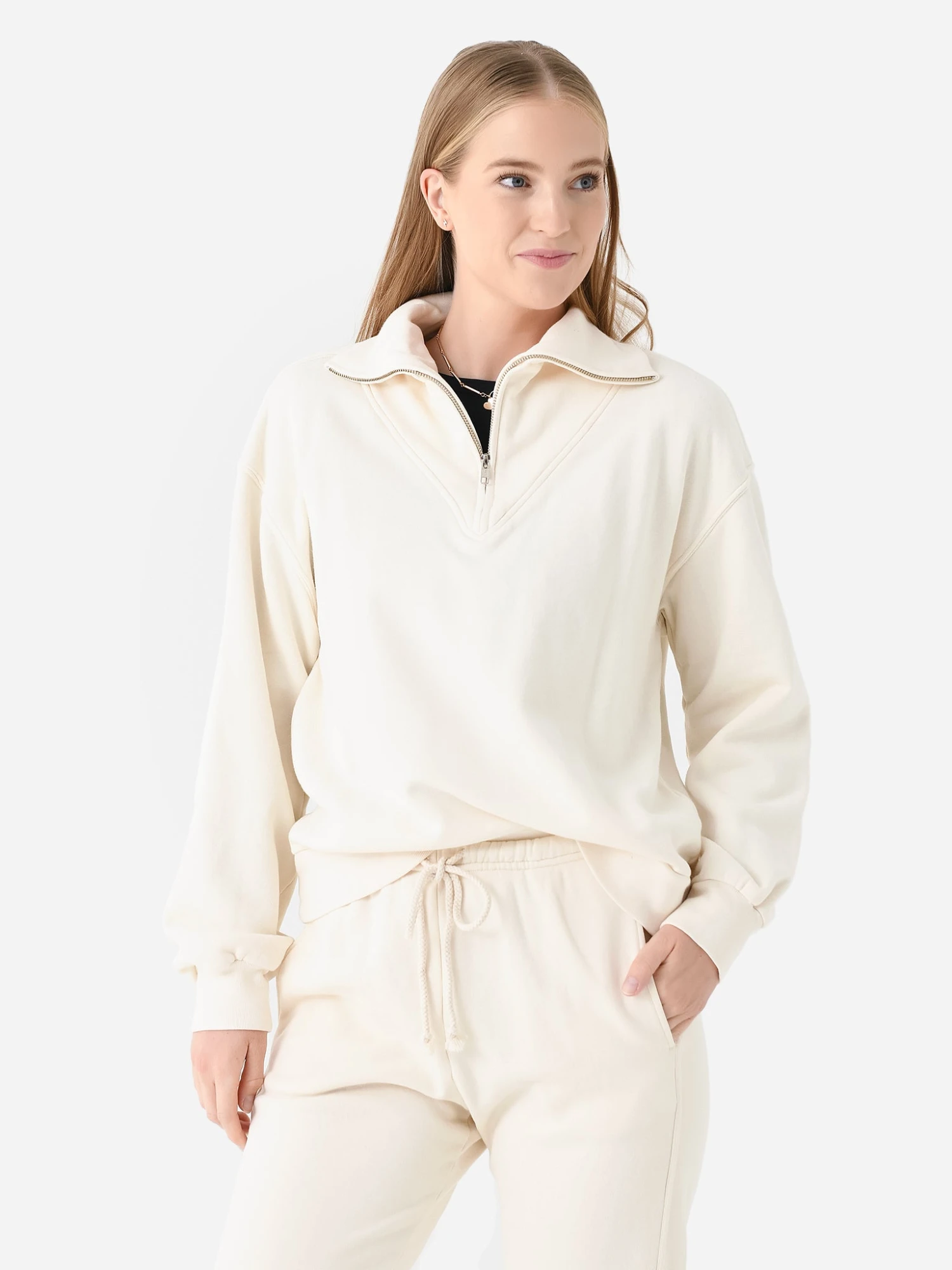 FEATURES:Stand-Up CollarQuarter-Zip ClosureDropped ShoulderBanded Cuffs100% CottonRelaxed FitModel is wearing size Small sweatshirt.Model’s Measurements: Height: 5’9.5″ | Bust: 32C | Waist: 26″ | Hips: 35.5″ | Dress Size: 2 (US)