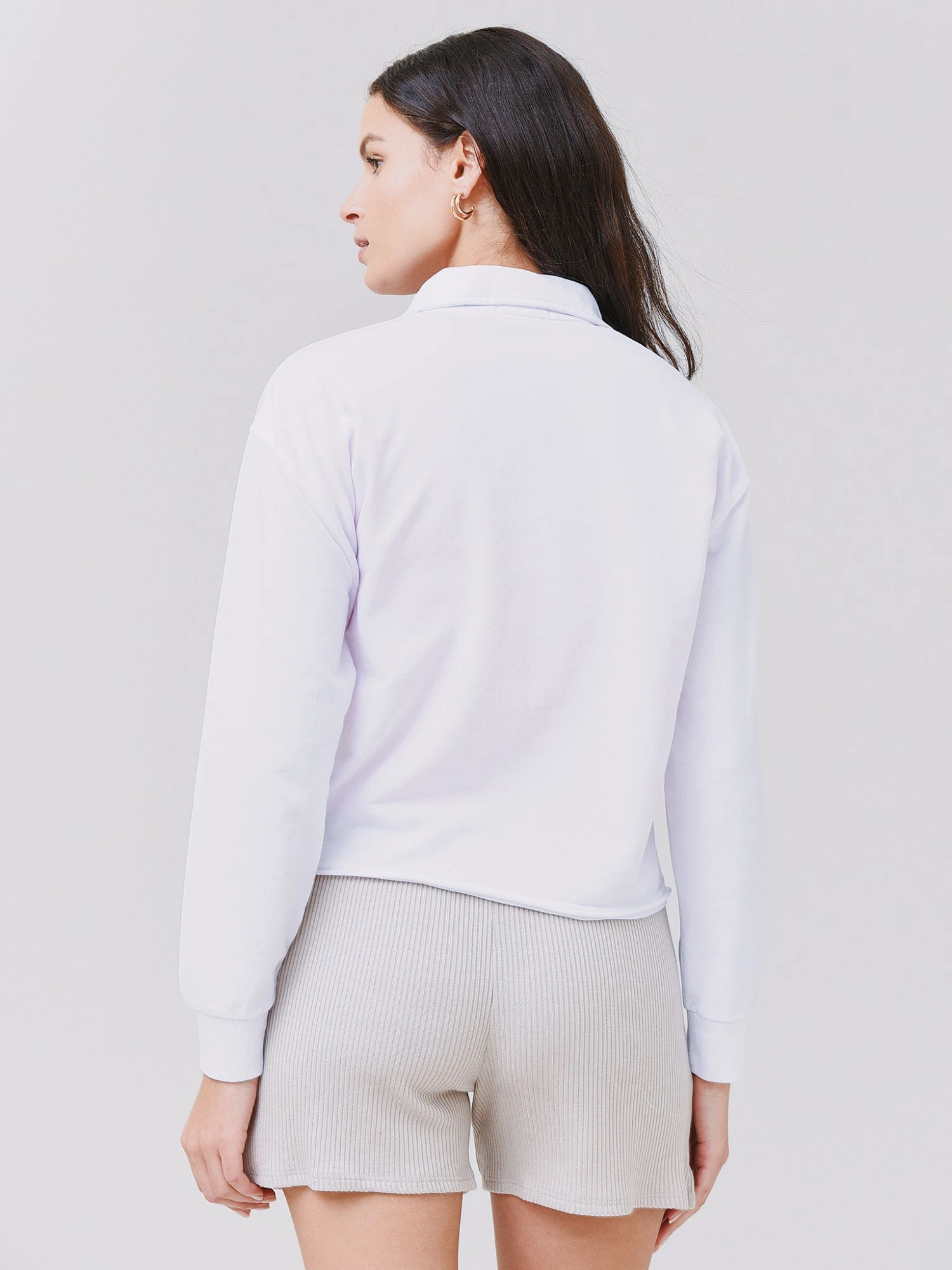 Sweatshirt with a collar, button placket, and raw hem.