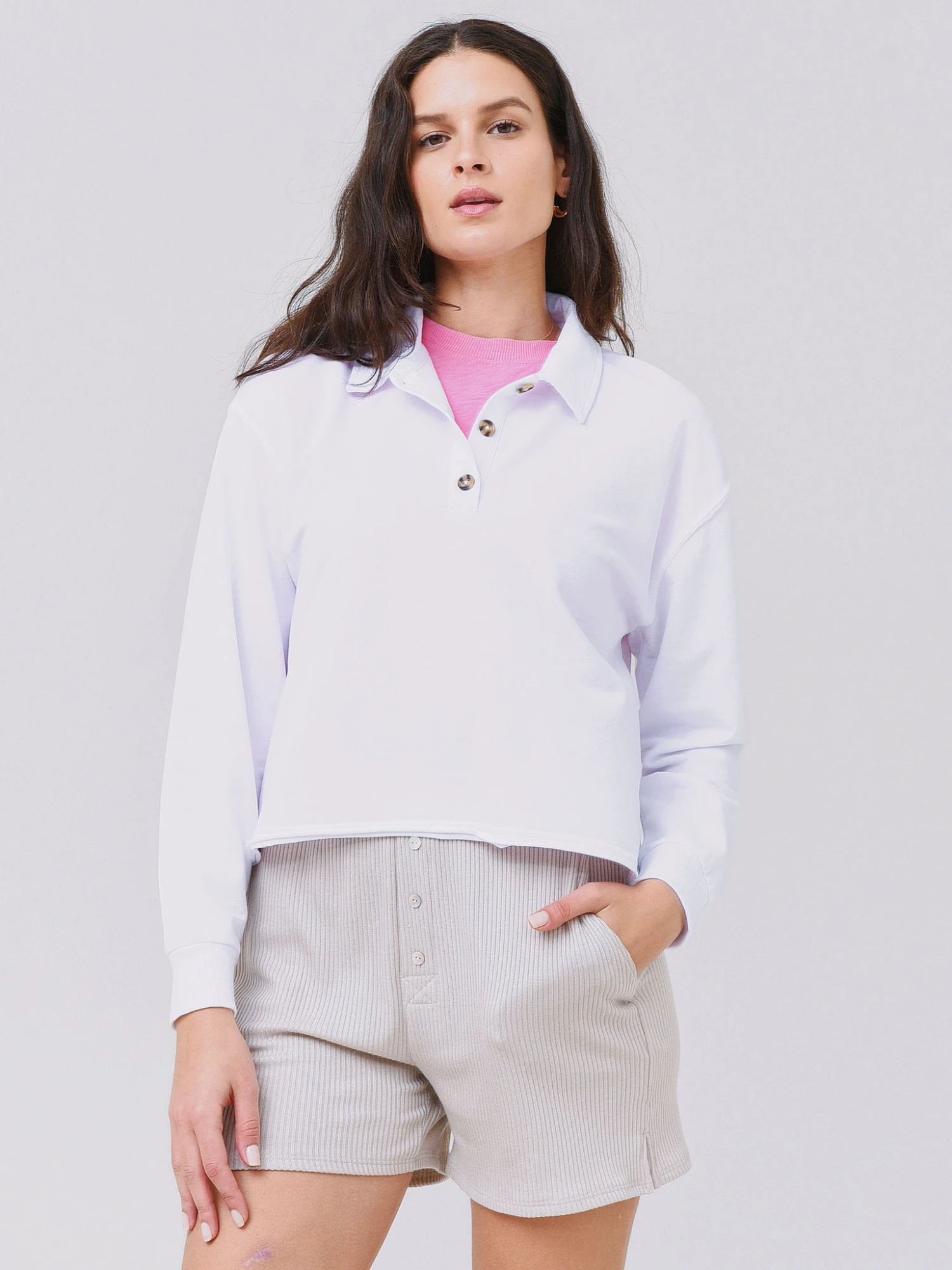 FEATURES:SweatshirtSpread Collar3-Button PlacketLong Sleeve w/ Banded CuffsRaw HemSlight Cropped SilhouetteFrench Terry Fabrication60% Cotton, 40% PolyesterRelaxed FitModel is wearing size Small sweatshirt.Model’s Measurements: Height: 5’9.5″ | Bust: 34B | Waist: 25″ | Hips: 37.5″ | Dress Size: 4 (US)
