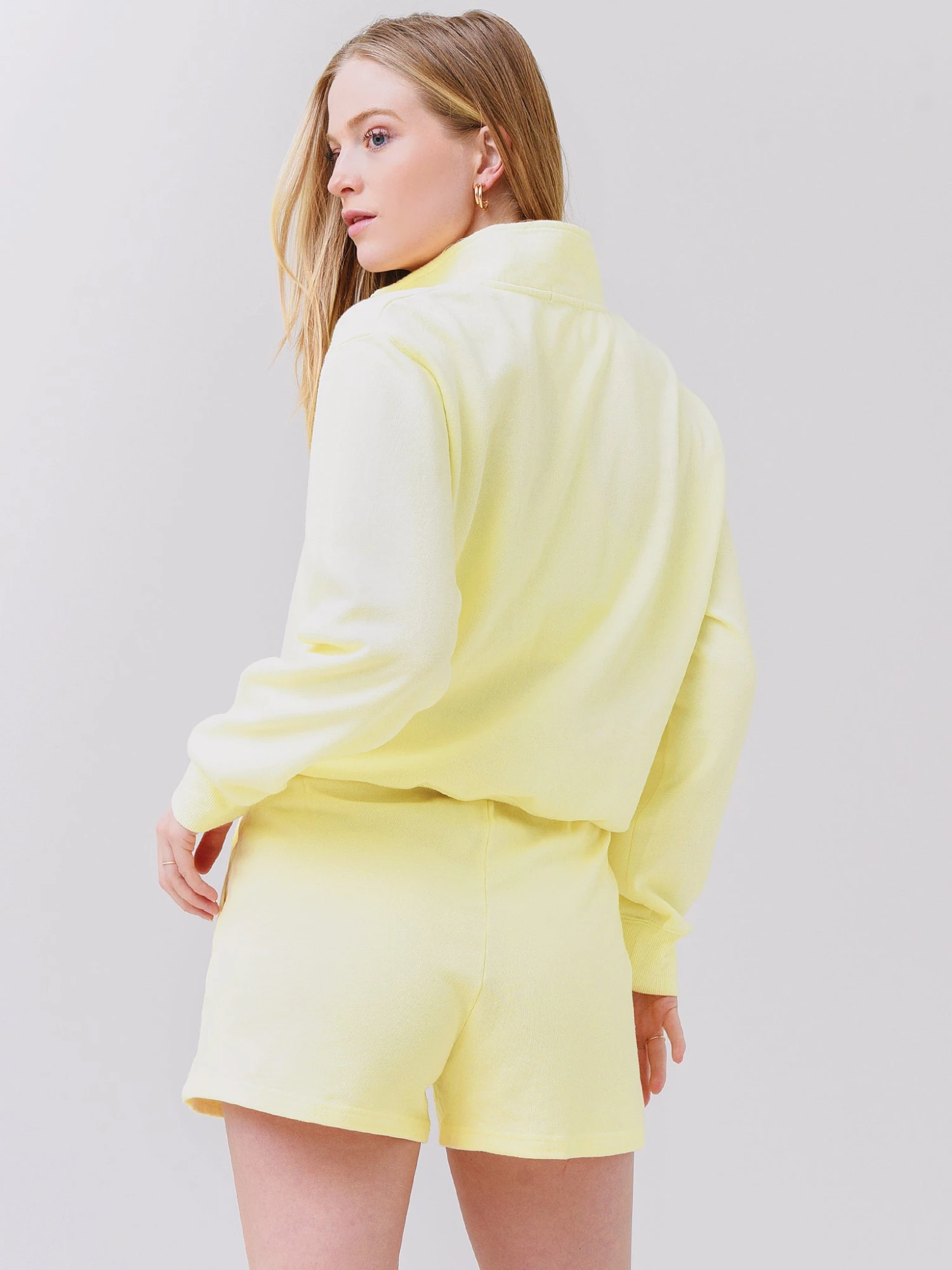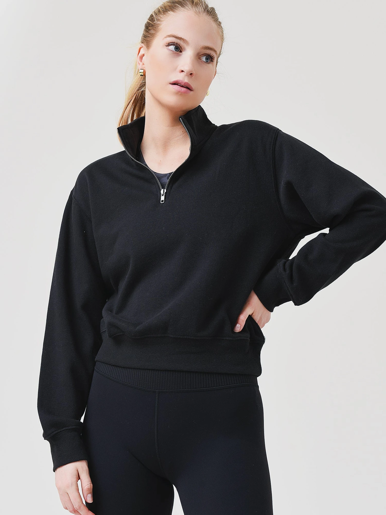 FEATURES:SweatshirtStand-Up CollarHalf-Zip ClosureDropped ShoulderLong SleeveBanded Cuffs and Hem w/ Rib Texture60% Cotton, 40% PolyesterRelaxed FitModel is wearing size Small sweatshirt.Sunrise, Black: Model’s Measurements: Height: 5’9.5″ | Bust: 32C | Waist: 26″ | Hips: 35.5″ | Dress: 2 (US)Jewel Pink, Pink Sky, Shadow: Model’s Measurements: Height: 5’9″ | Bust: 34B | Waist: 26″ | Hips: 37″ | Dress Size: 2-4 (US)